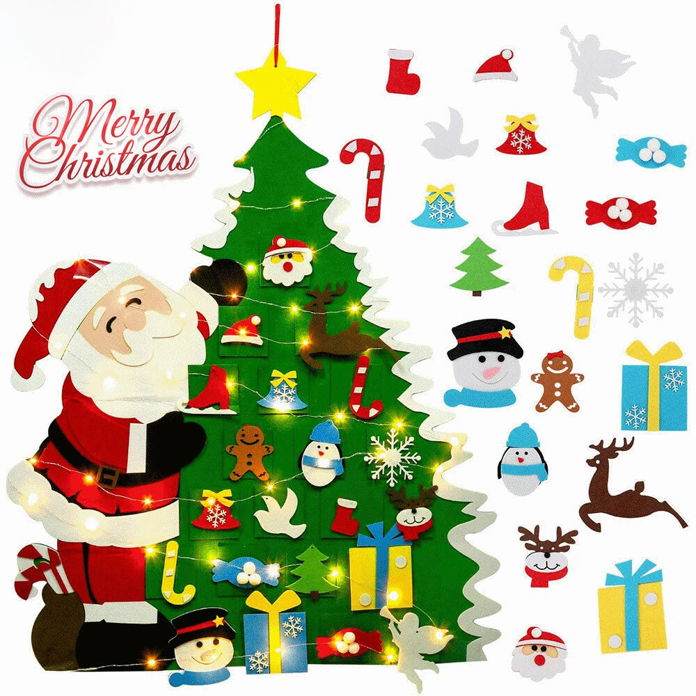 3.2FT Felt Christmas Tree Decorations Set Wall Hanging Ornaments w/ String Light (Santa Claus w/ Lamp)