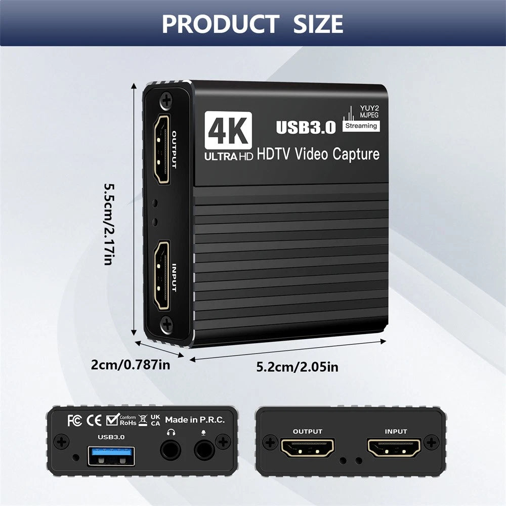 This HDMI Video Capture Card is a versatile tool designed for streaming, video conferencing, live broadcasting, game streaming, and screen recording. It supports up to 4K 30fps input and Full HD 1080p 60fps capture, delivering smooth, high-quality video for all your needs. With plug-and-play functionality—no driver installation or external power required—it’s incredibly easy to use, working seamlessly with third-party software like OBS for capturing or streaming HD gameplay and other video sources. Built with advanced chips, it ensures high-speed, lag-free transmission, while its wide compatibility (Windows, Mac OS, and most devices like cameras, DSLRs, PS4/PS5, Xbox, Switch, and Steam Deck) makes it a go-to choice for both casual and professional use. Plus, it captures video and audio simultaneously, with a 4K loop-out for preview, and includes 3.5mm audio ports for adding external commentary.