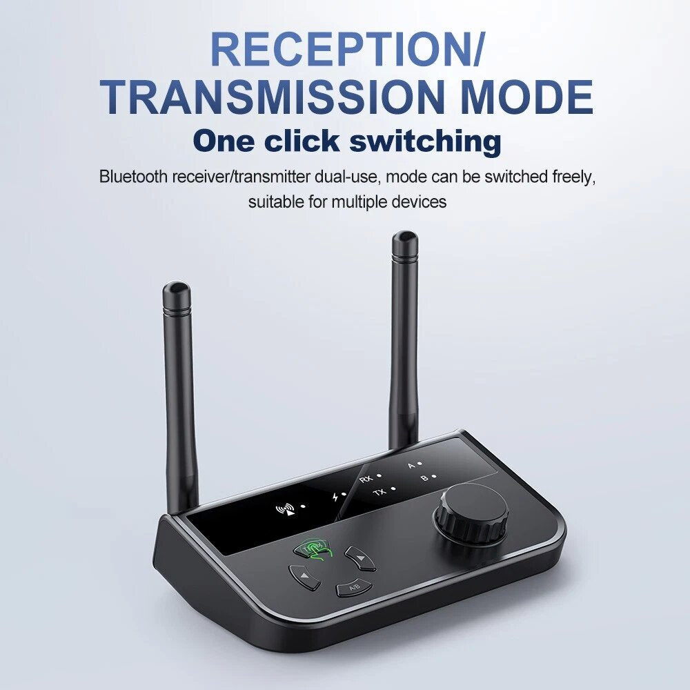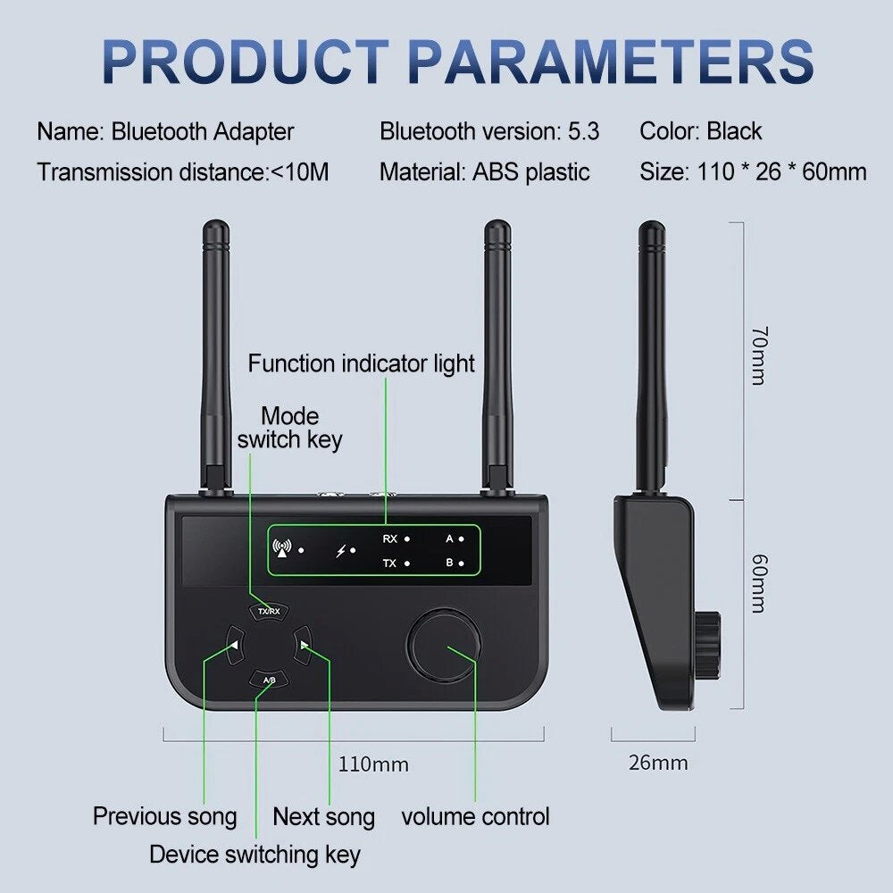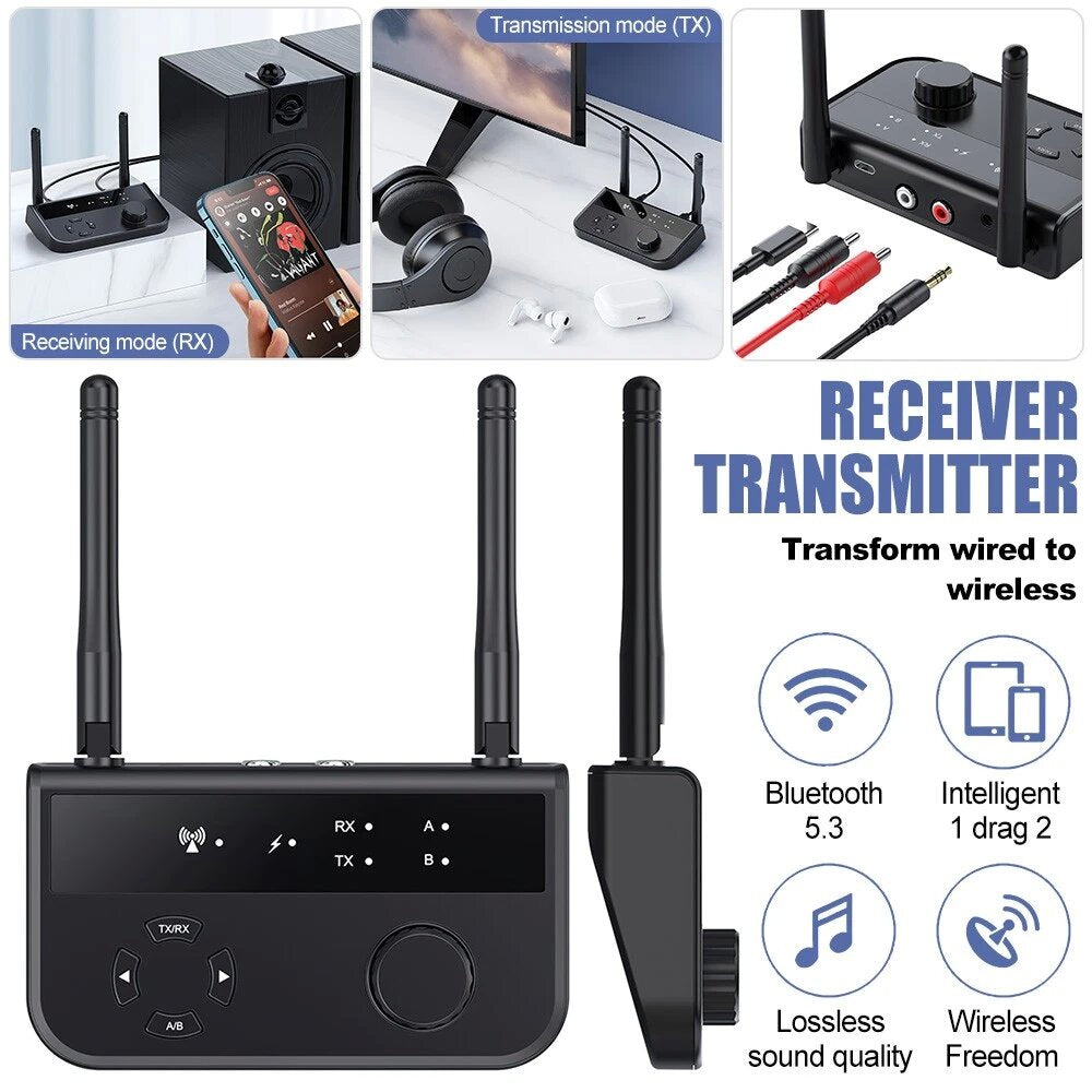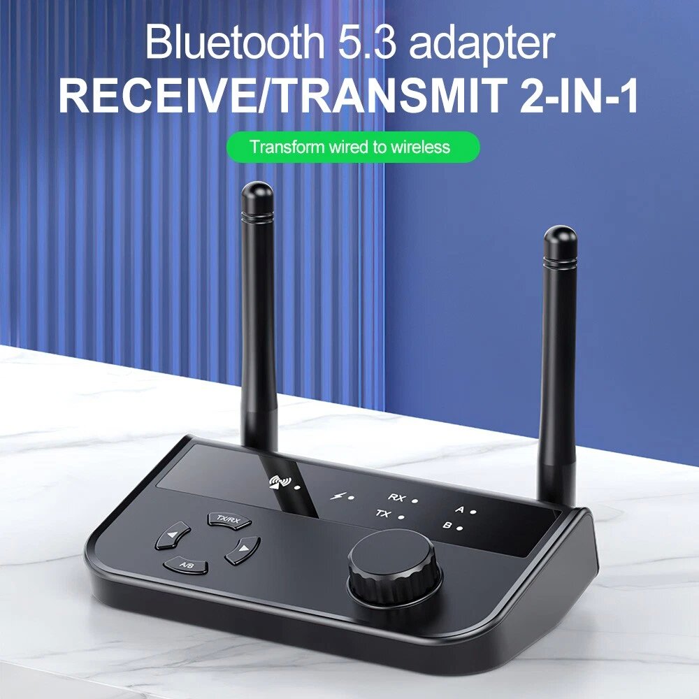 The 5.3 Long Range Bluetooth Transmitter Receiver is a versatile and high-performance Bluetooth adapter designed to enhance your TV or home stereo experience. Featuring dual antennas for an extended range of up to 10 meters, it allows you to wirelessly connect your devices with ease. With two-way transmission, it offers seamless switching between transmit and receive modes, giving you the flexibility to enjoy music or audio in different settings. Whether you're enjoying a movie without disturbing others or streaming music to an older speaker, this adapter delivers a high-quality, lossless audio experience without delay.
