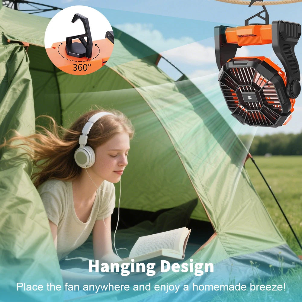 Portable LED Fan Camping Lights Rechargeable For Outdoor USB Tent Lamp With Hook Orange