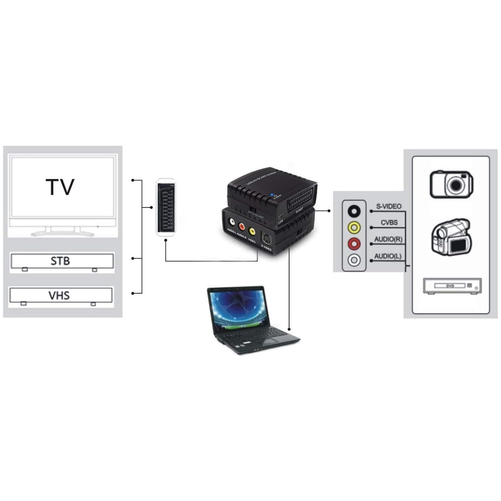 - Dual Modes (AV/SCART): Side switch controls input/output: AV mode for cameras/VHS/DVDs (output to TV/PC); SCART mode for TVs/VHS/STB (or PC via USB, output via AV/S-video).