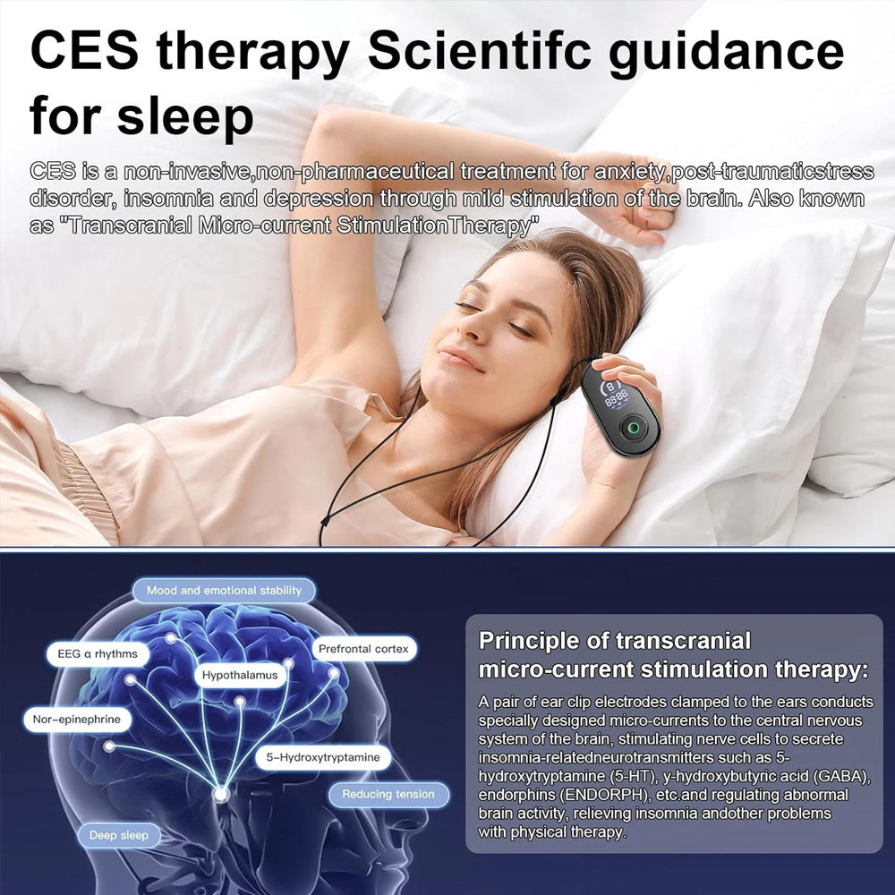 Tired of struggling with insomnia, anxiety, or the lingering effects of post-traumatic stress disorder? Our Sleep Aid Device offers a safe, drug-free solution to help you reclaim restful nights. Powered by Cranial Electrotherapy Stimulation (CES) technology, it gently stimulates the brain to regulate neural activity, effectively easing anxiety and guiding your body into a natural sleep state.