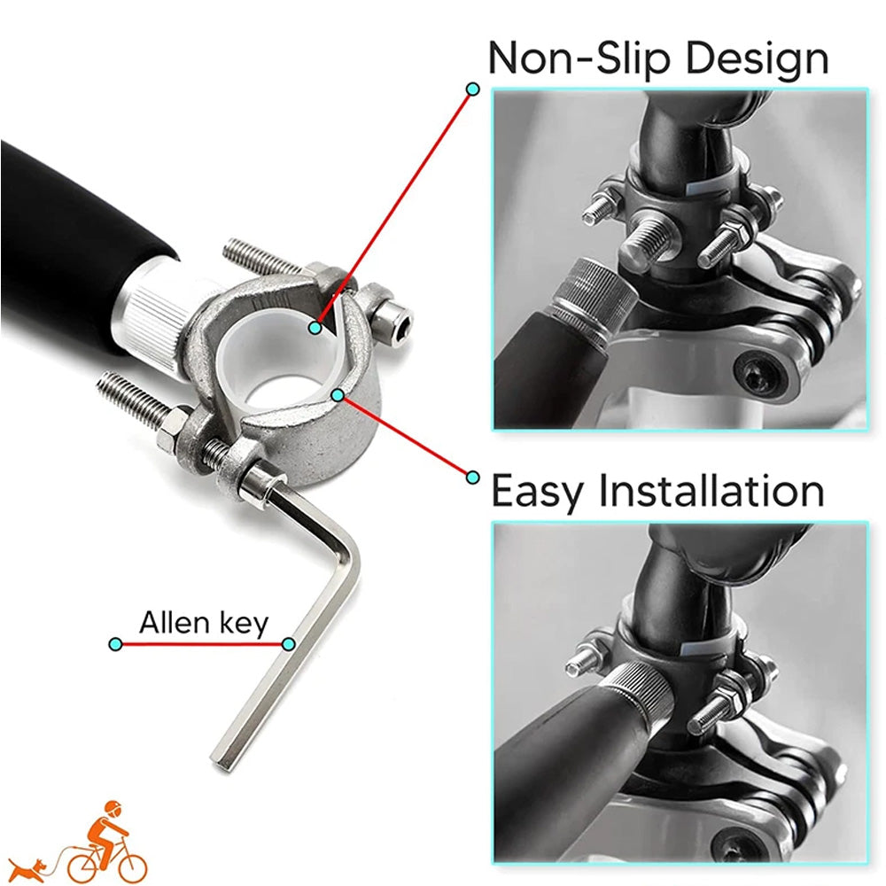 • Secure Grip & Protection: Features a stainless steel bar with a silicone-covered handle for comfortable use as a walking leash. The steel clamp includes a non-slip rubber piece to prevent scratches and protect your bike frame.
