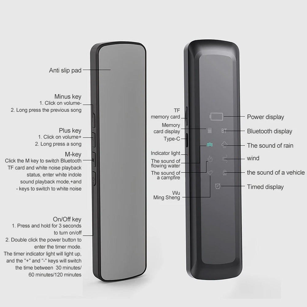 Experience deep relaxation and peaceful sleep with our advanced wireless under pillow speaker. Designed for comfort and convenience, it features 8 types of soothing sounds, including white noise, flowing stream, gentle rain, crackling fireplace, ocean waves, bird songs, and soft traffic ambiance. These sounds help ease stress, calm your mind, and create the perfect environment for restful sleep. Utilizing bone conduction technology, the speaker delivers clear, personal audio without disturbing others. With Bluetooth 5.0, TF card support, and a built-in rechargeable battery, this speaker is your ideal companion for meditation, focus, and sleep enhancement.