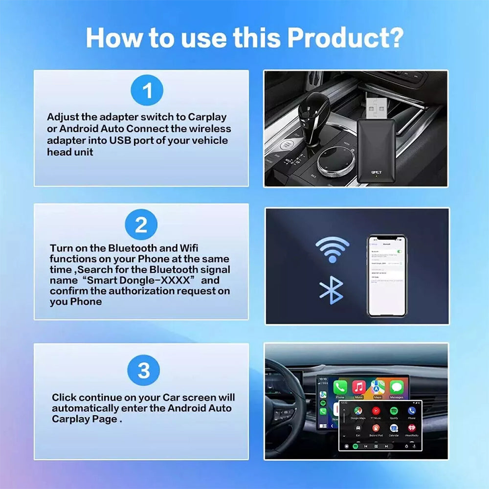 - 2-in-1 Wireless Adapter: Supports both wireless CarPlay for Apple devices and wireless Android Auto for Android devices.