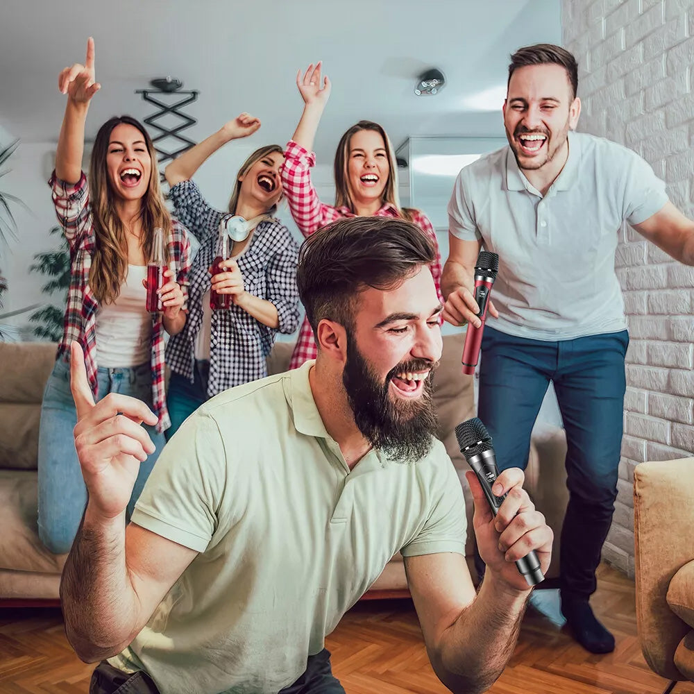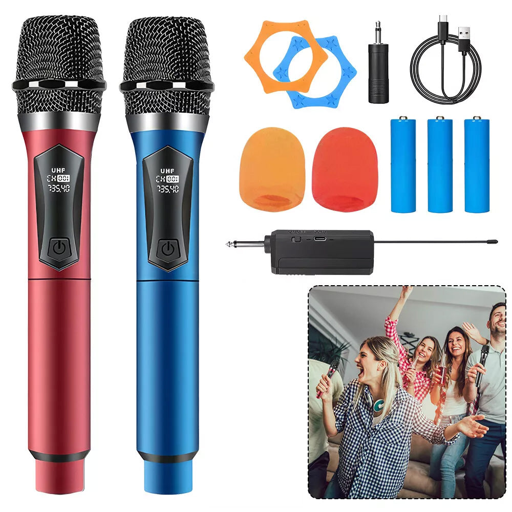 - Wireless UHF Karaoke Microphone System: Enjoy distortion-free, high-quality sound. The set includes two dynamic handheld microphones with built-in rechargeable and replaceable batteries.