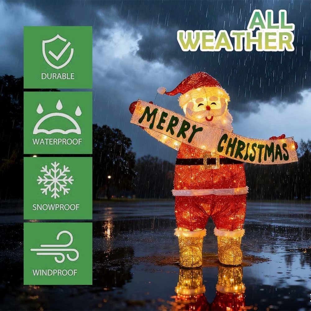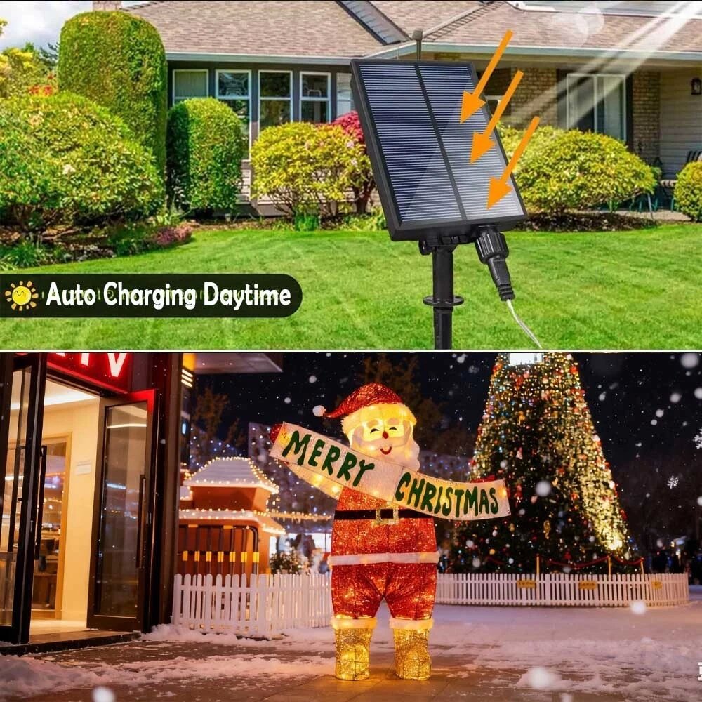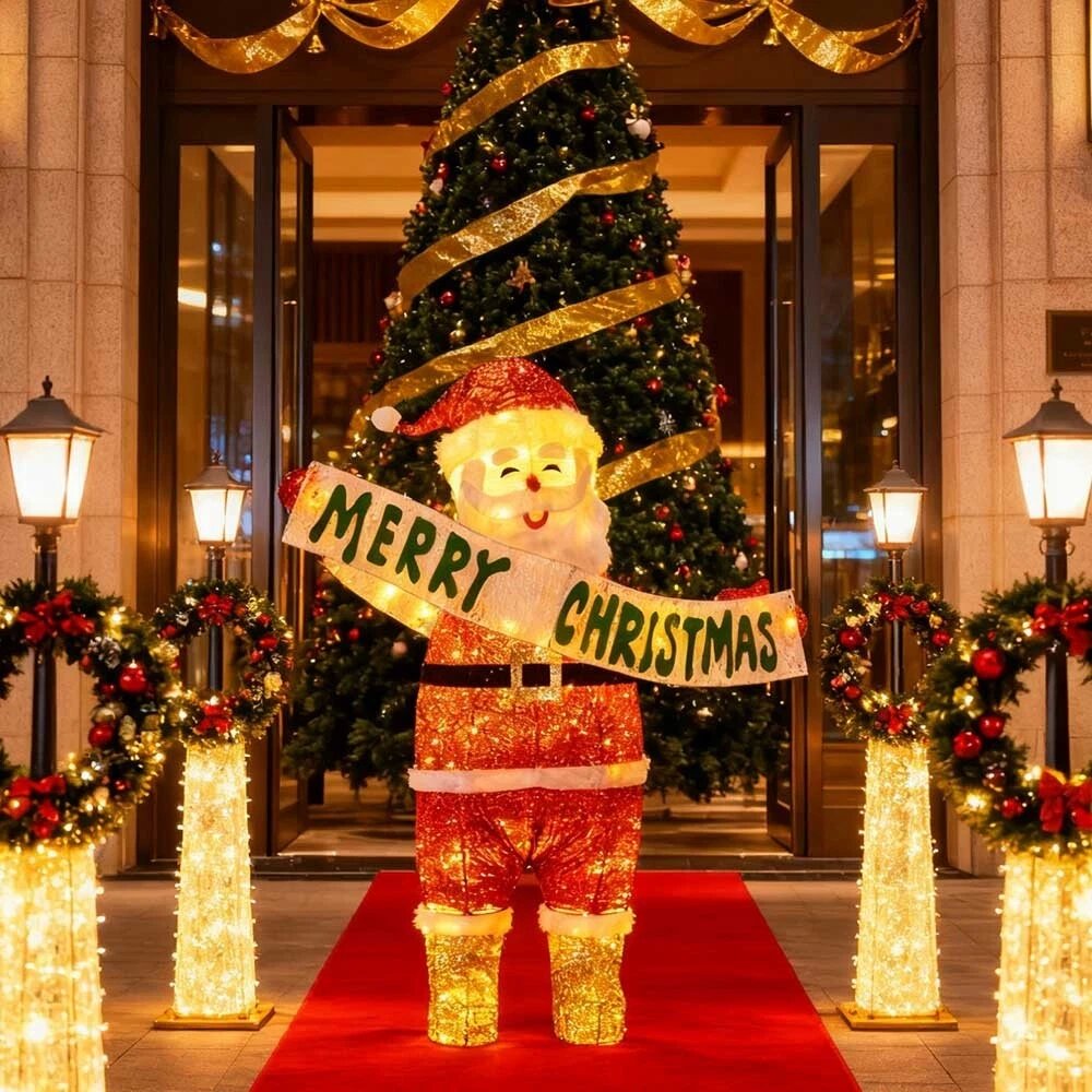 Inject unique magic into your Christmas decor with this stunning solar - powered illuminated Santa Claus! Standing out prominently, he is covered with twinkling lights, wearing his iconic red suit with white details and shiny golden boots. Holding a banner that says "MERRY CHRISTMAS", he is an excellent focal point for holiday decorations, whether in shopping malls, parties, or your own space, spreading holiday warmth and joy to everyone.