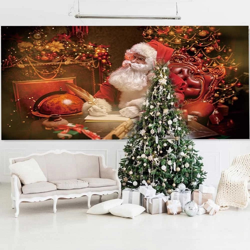 Elevate your Christmas decor with this enchanting garage door banner! Featuring a heartwarming scene of Santa Claus hard at work, penning down holiday wishes, it's set against a backdrop of a festively adorned room with twinkling lights, a beautifully decorated Christmas tree, and cozy candles. Made from top-notch polyester fabric, this banner is built to last through numerous holiday seasons while keeping its vibrant and clear print. Whether you're prepping for an intimate family get-together or a grand Christmas celebration, the 230cm x 480cm size ensures ample coverage, creating a warm and inviting holiday ambiance that will captivate your guests.
