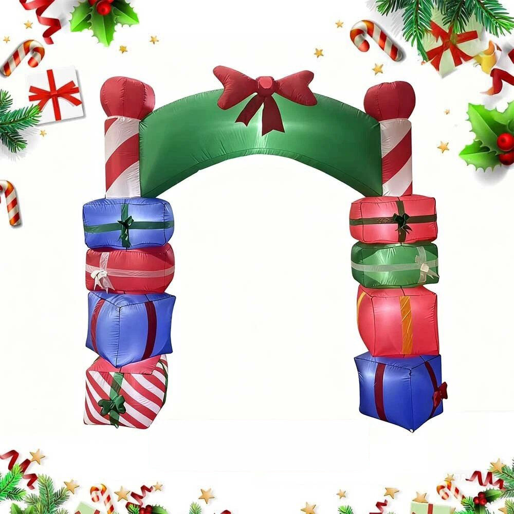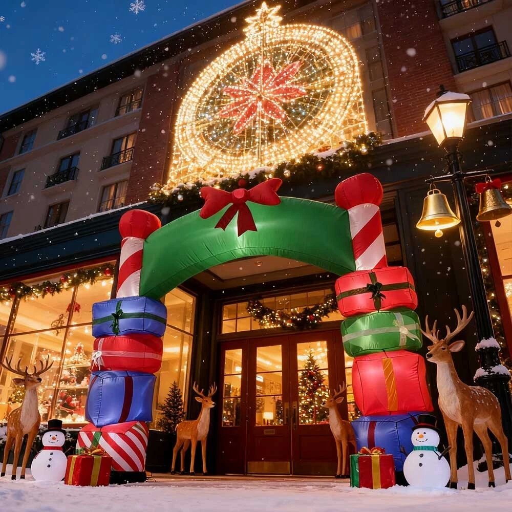 This Christmas inflatable arch is a eye-catching decoration tailored for creating festive atmospheres. Its overall design centers on classic Christmas elements—colorful gift boxes, "candy pillars" with red and white stripes, and a red bow at the top of the arch. Taking bright colors like Christmas red and green as the main tones, it instantly injects a lively and rich festive vibe into yards, event venues, and other spaces, turning your outdoor area into a warm and striking spot. Whether for home Christmas decorations, shopping mall entrance arrangements, or various holiday event scenarios, this inflatable arch stands out with its vibrant appearance. During the day, it brightens up the environment with vivid colors; at night, when paired with lights (to be prepared separately), it further creates a dreamy atmosphere. It delivers an unforgettable holiday experience for you, your family, and guests, and becomes a highly recognizable decorative highlight in the Christmas season.