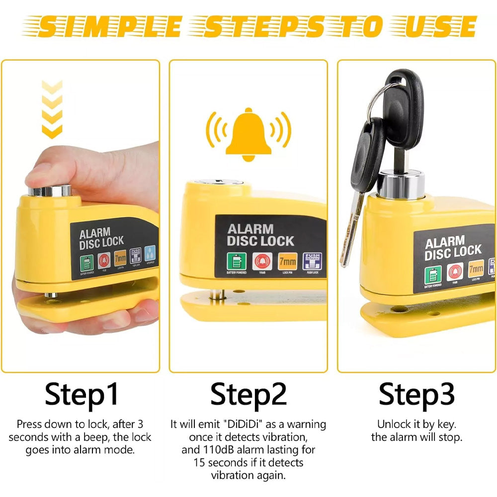 Protect your motorcycle, moped, or bike with this high-security Anti-theft Alarm Motorbike Lock. Equipped with a built-in vibration sensor, this alarm disc lock will activate with a loud “DiDiDi” warning if any movement or vibration is detected. If the movement continues, the lock will emit a powerful 110dB alarm lasting 15 seconds, alerting people nearby and deterring potential thieves. This is the perfect solution for ensuring the safety of your vehicle when you're not around.