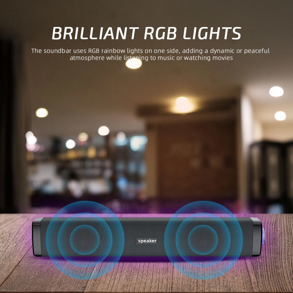 Enhance your audio experience with this Desktop Soundbar, designed to deliver crystal-clear sound with powerful bass. Whether you’re gaming, watching movies, or enjoying music, this speaker provides a rich and dynamic audio experience with dual 3W high-power speakers and a hybrid diaphragm. The RGB rainbow lights add a touch of ambiance to your setup, creating the perfect atmosphere for any occasion. Its compact design fits seamlessly on your desk, and the easy plug-and-play connection ensures you’re up and running in no time.