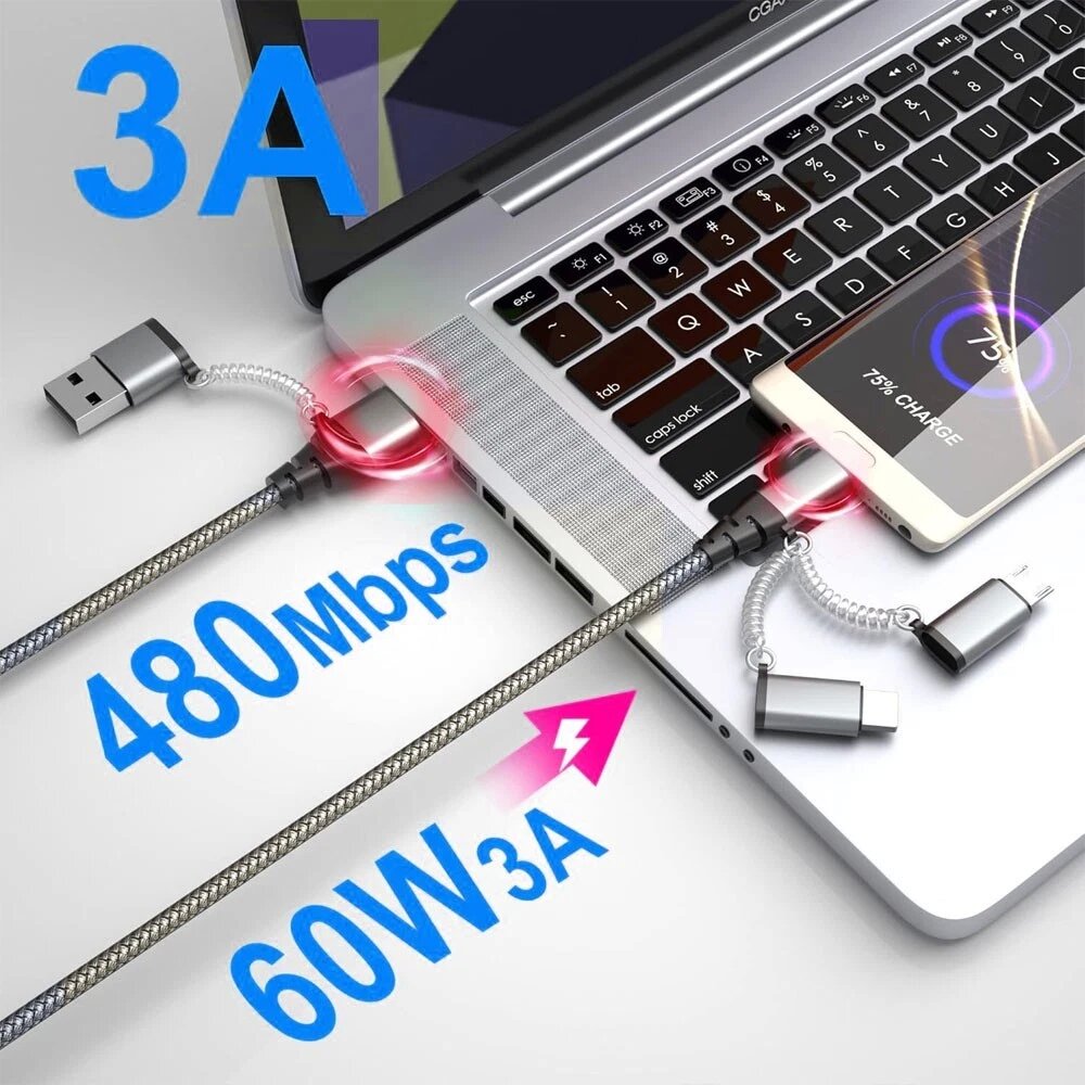 Tired of carrying a bunch of cables for your various devices? Our Reversible USB C Master Cable is here to simplify your life! This innovative cable serves as a USB C to USB C host cord, supporting PD 3.0 60W 3A charging, and comes with interchangeable 2-in-1 USB C/A to 3-in-1 iPhone/Type C/Micro connectors. It's designed to work seamlessly with 60W/30W/18W USB C/A power adapters, making it the ultimate all-in-one charging solution for your daily needs, whether you're at home, in the office, or on the go.