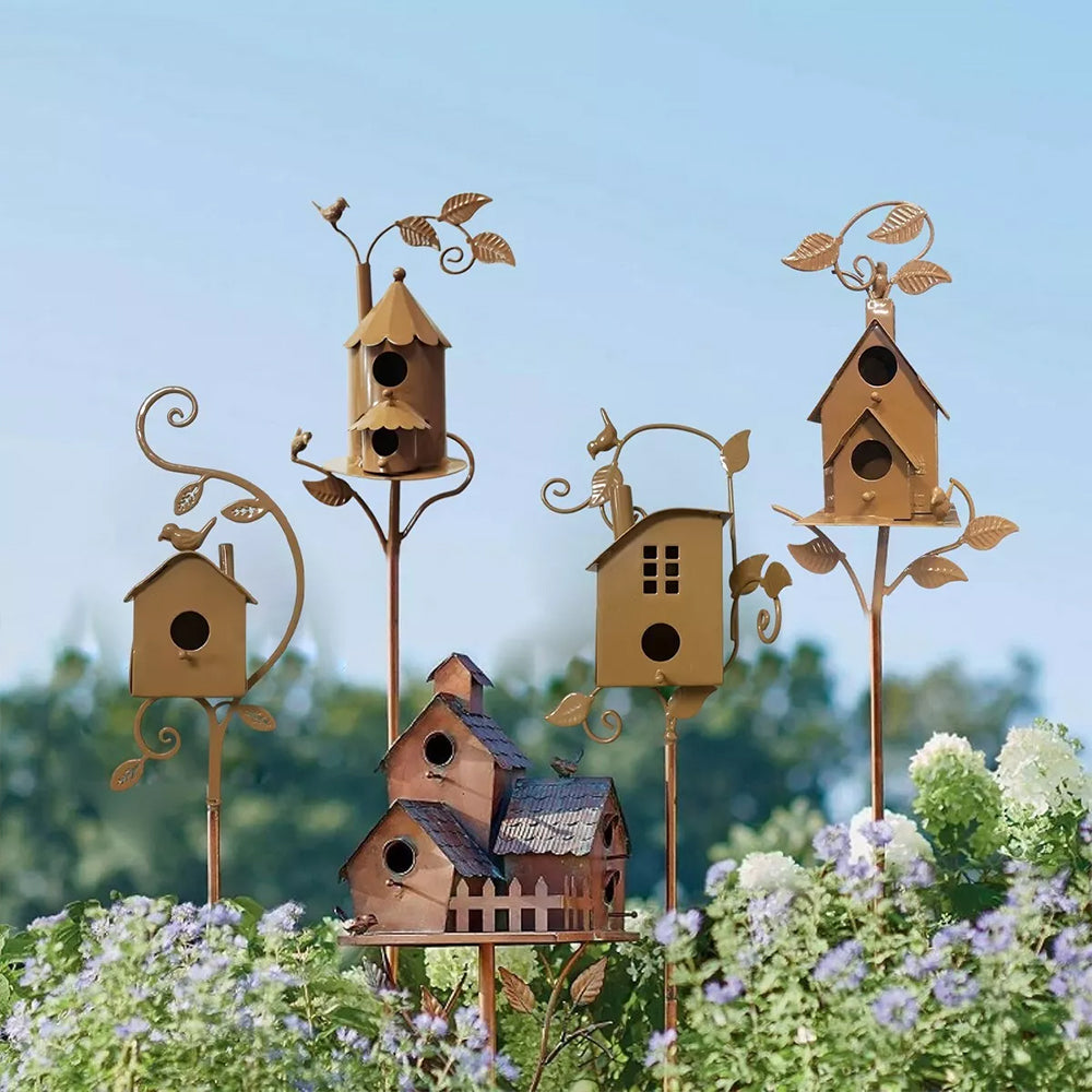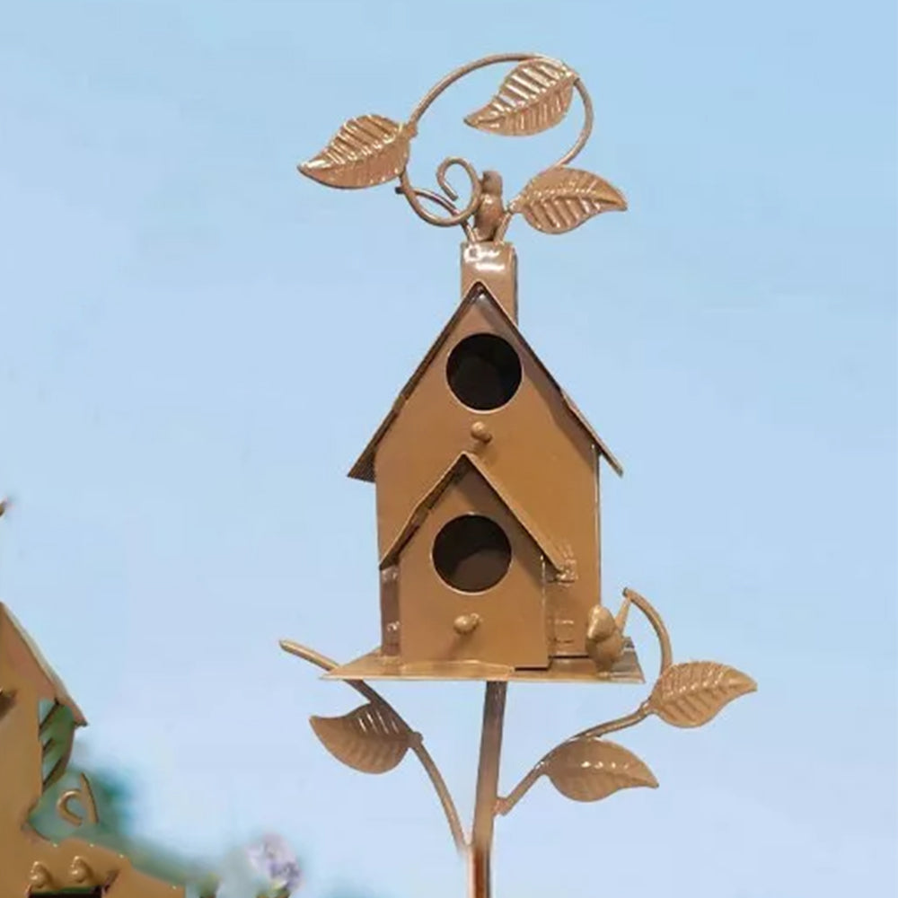 Outdoor Iron Birdhouse Garden Stakes - Metal Craft Bird House for Yard Decor D