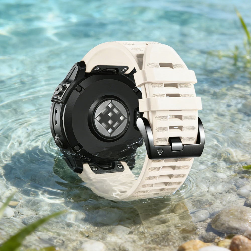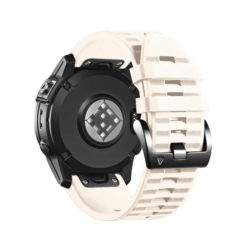 Our Garmin Watch Band is made of high quality soft environmental silicone. No peculiar smell and harmless. No extra edge to hurt your hands. The silicone band special designed with two secure clasps will protect it from slipping off. It fits great and more securely when you biking or working out. With Garmin Quickfit design, no tools needed, no extra screws needed. Just put on or take off the band by your hands. The watch strap fit wrist 5.31inches-8.85inches (135mm-225mm). Please kindly measure your wrist before purchasing.