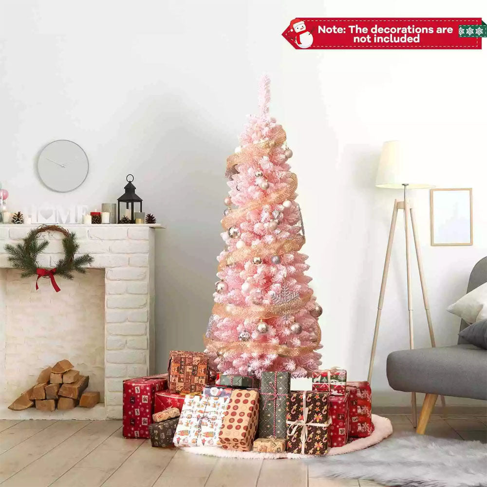 Create stunning holiday displays effortlessly with the1.8M Pink Flocked Artificial Christmas Tree. This eye-catching tree features vibrant pink foliage, enveloped in thick snow flocking, making it an opulent and charming centerpiece for your festive decor. With 460 dense branch tips, it offers a full-bodied, natural look that is sure to impress. Crafted from flame-retardant and odorless PVC material, this tree ensures safety, durability, and longevity, perfect for enjoying many holiday seasons. The crossed metal base provides sturdy support, preventing wobbling and offering a secure placement. Its slender pencil shape is ideal for fitting in tight corners or smaller spaces, making it a versatile choice for a variety of settings. Whether you prefer a traditional look with classic ornaments or want to explore themed decorations for any celebration, this pink Christmas tree will elevate your holiday spirit.