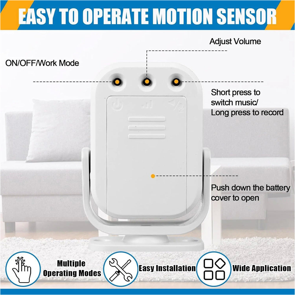 Introducing the Motion Sensor Door Chime, a versatile solution that blends convenience with real-time alert capabilities for home and commercial spaces. Made of high-quality ABS material, this advanced device comes with a full suite of features to elevate your living and working environment. It offers flexible power options: DC5V, 3 AAA dry batteries(not included), or 3 AAA rechargeable nickel-metal hydride batteries(not included), ensuring stable operation even during power outages. With 3 adjustable volume levels, 12 built-in music tracks, and 20-second repeatable recording functionality, you can customize alerts to suit your needs—whether it’s a friendly welcome sound, a deterrent effect, or a personalized message. Equipped with a high-power broadcast speaker, the chime delivers clear, audible alerts. Boasting a detection range of 2-8 meters (subject to environmental conditions), it’s perfectly suited for use in homes, offices, and stores, keeping you informed of movements at entryways, mailboxes, driveways, and more.