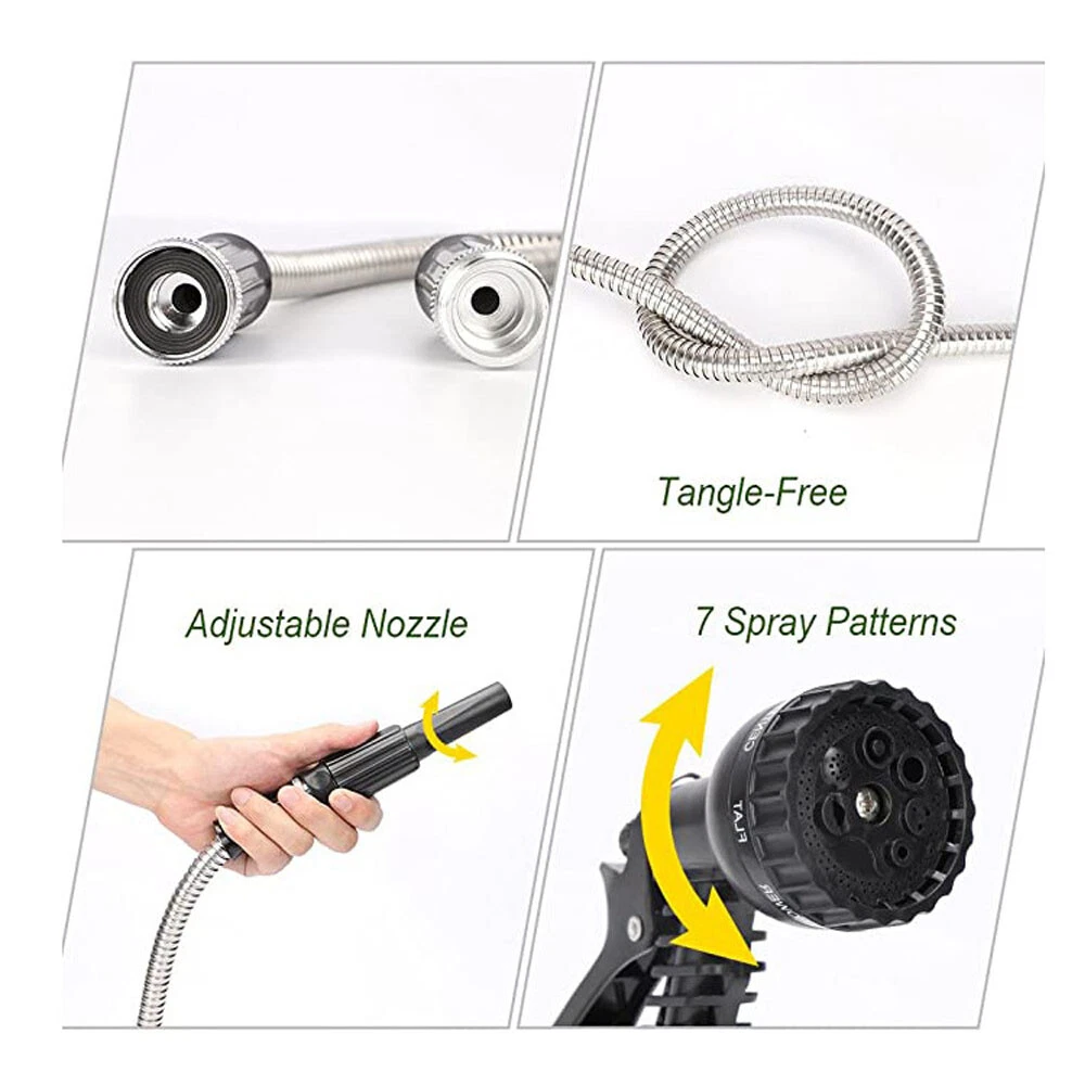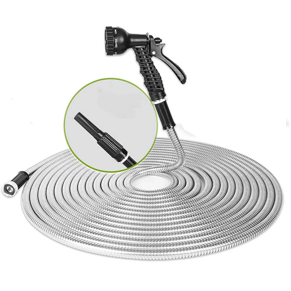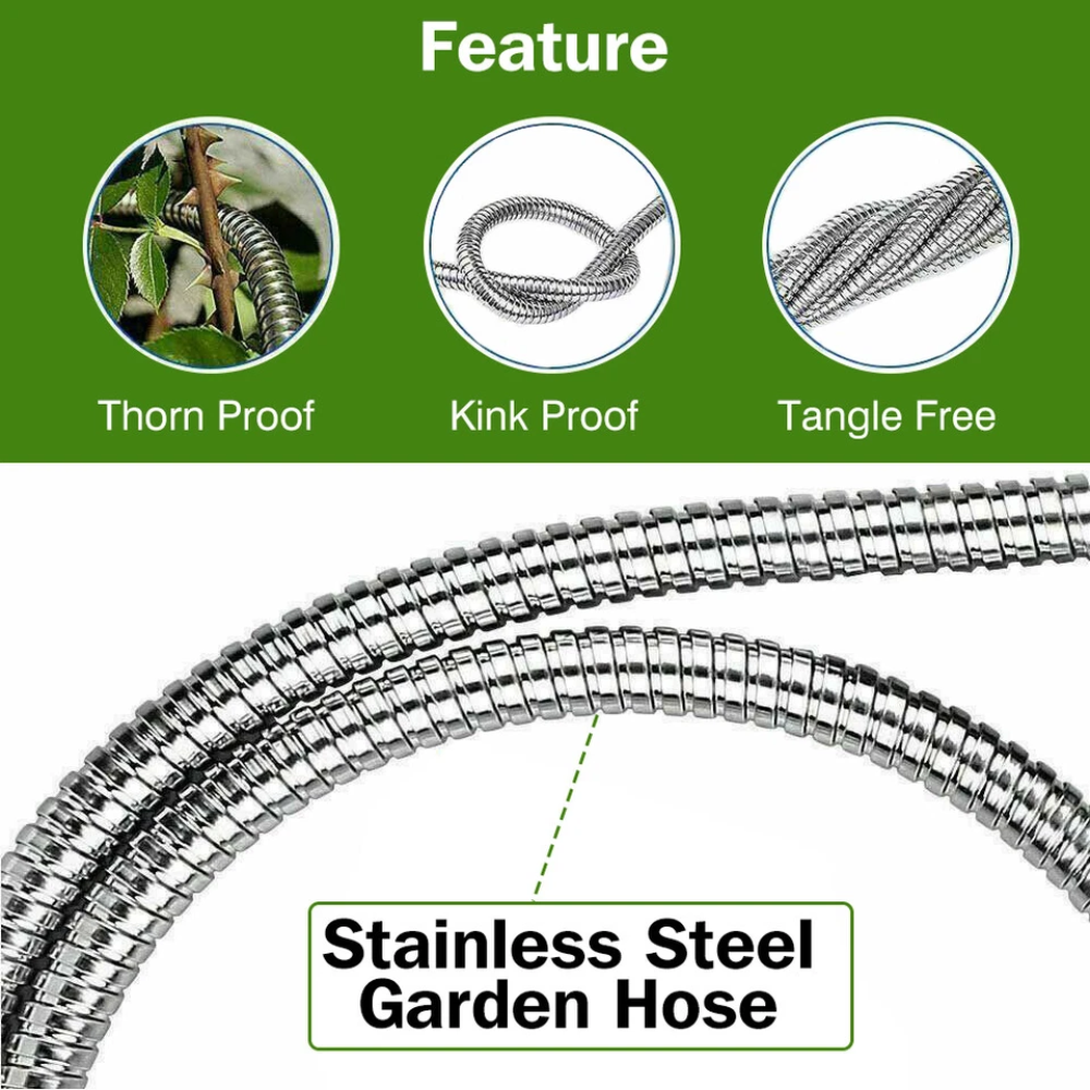 The internal rubber hose ensures steady water flow without leakage, while the solid metal connectors provide secure attachment to standard faucets. Lightweight, kink-free, and extremely easy to coil, this stainless steel hose delivers both convenience and durability for everyday gardening, cleaning, watering, and household use.