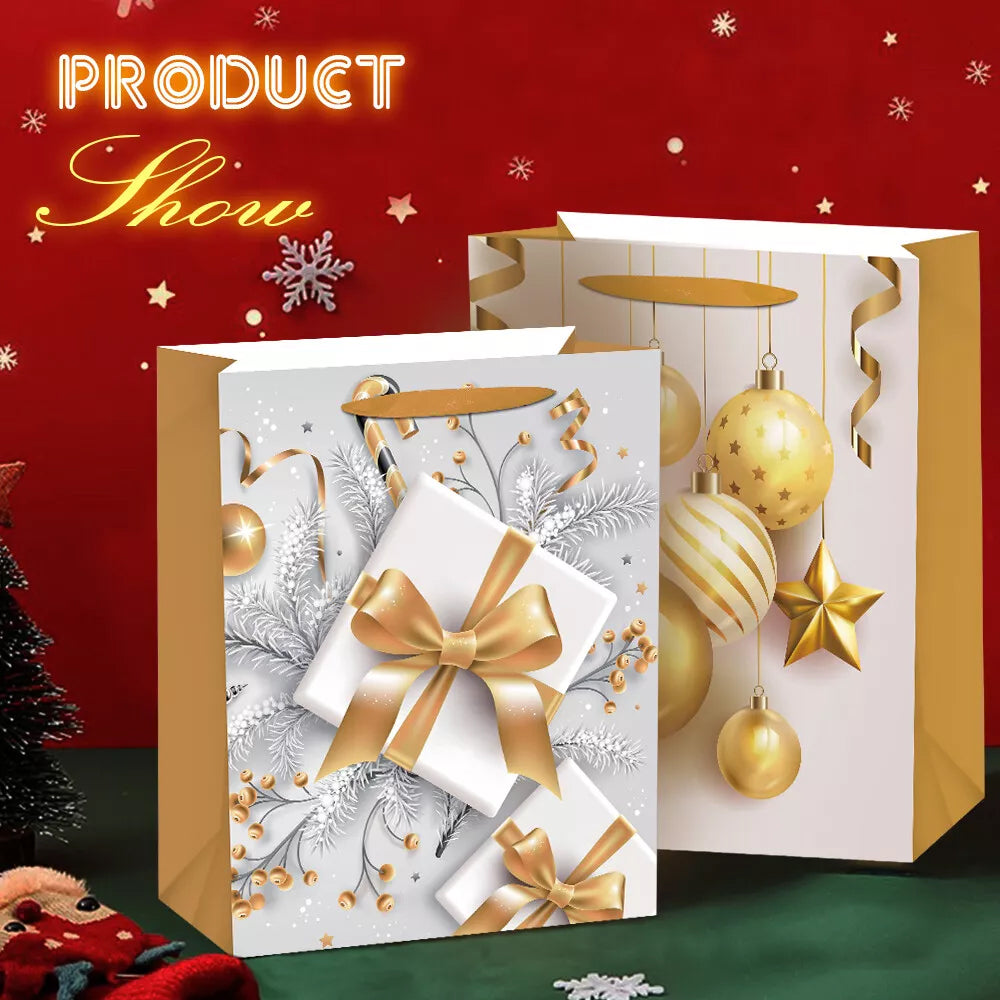 Make your holiday gift-giving extra special with this Set of 12 Christmas Gift Bags. Crafted from durable, thick coated paper and designed with festive holiday patterns, these bags add a charming touch to any Christmas present. Each bag is decorated with high-quality prints including golden reindeer, decorated Christmas trees, and beautifully wrapped gifts, creating a joyful holiday atmosphere. With sturdy ribbon handles, these bags are not only stylish but also practical for carrying gifts with ease. Perfect for presents, party favors, or seasonal treats, this set of gift bags ensures your gifts are presented beautifully throughout the festive season.
