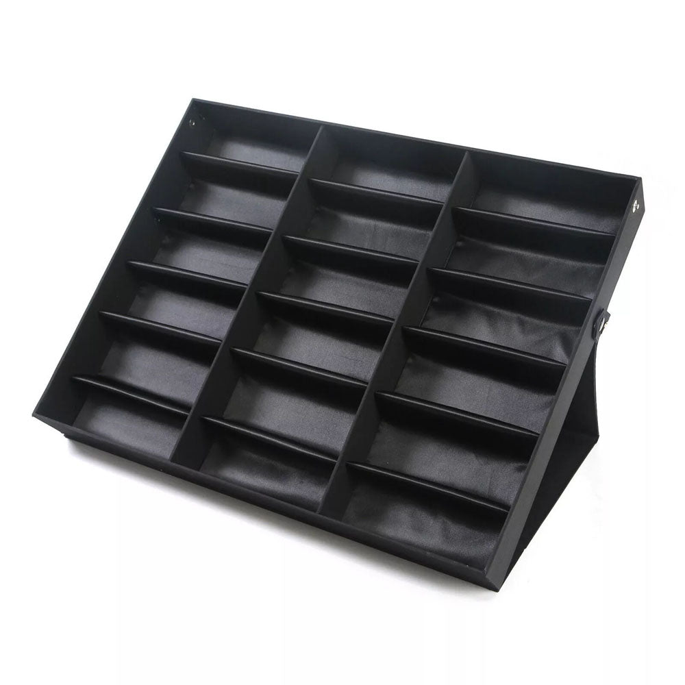 Organize and display your eyewear collection with this 18-grid glasses display box. Designed for both personal use and retail settings, this sleek and practical case is crafted from durable density fiberboard with a foldable lid that doubles as a support stand. Whether you're a collector or a shop owner, this box offers a professional and elegant way to keep your sunglasses or eyeglasses sorted, protected, and beautifully displayed.