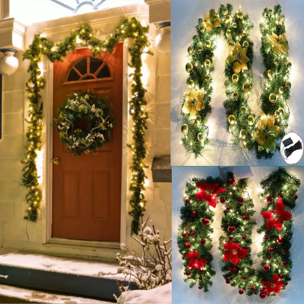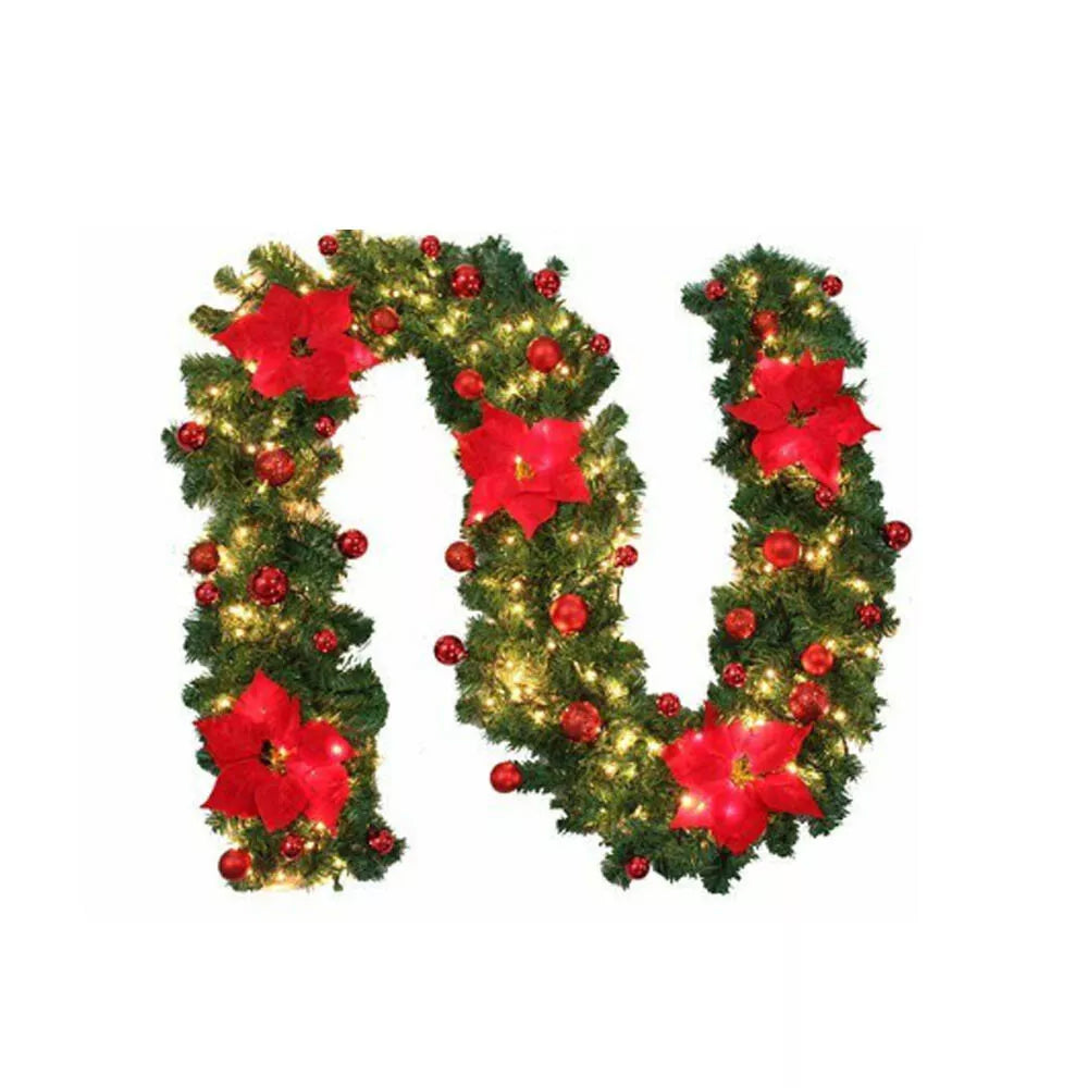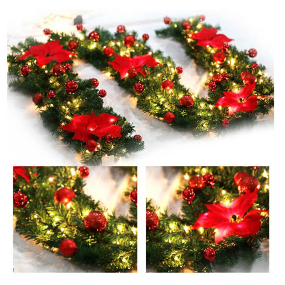 2.7M Christmas Garland with Lights / Flower /Pinecone Xmas Home Stairs Fireplace Red with Lights