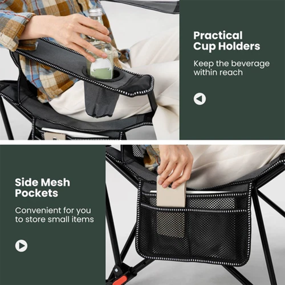 The chair features 4 adjustable backrest positions, letting you customize your recline angle for optimal comfort—whether you want to sit upright and chat, lean back to read, or fully recline to nap. Crafted for durability, it boasts a sturdy cross metal frame and tear-resistant 600D Oxford cloth, supporting up to 150kg for long-lasting use. The mesh seating area enhances air circulation, keeping you cool and refreshed even during extended sits, while thoughtful details like a padded headrest, wide armrests, and anti-slip foot mats elevate comfort and stability. When it’s time to pack up, the collapsible design folds compactly, and it comes with a carrying bag for easy transport and storage.