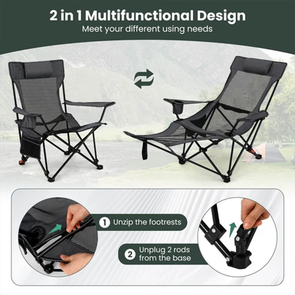 - 2-in-1 Convertible Design: Removable footrest lets you switch between a camping seat and a recliner effortlessly—meet your needs for sitting (e.g., fishing, chatting) and lying (e.g., napping, relaxing) in one chair.
