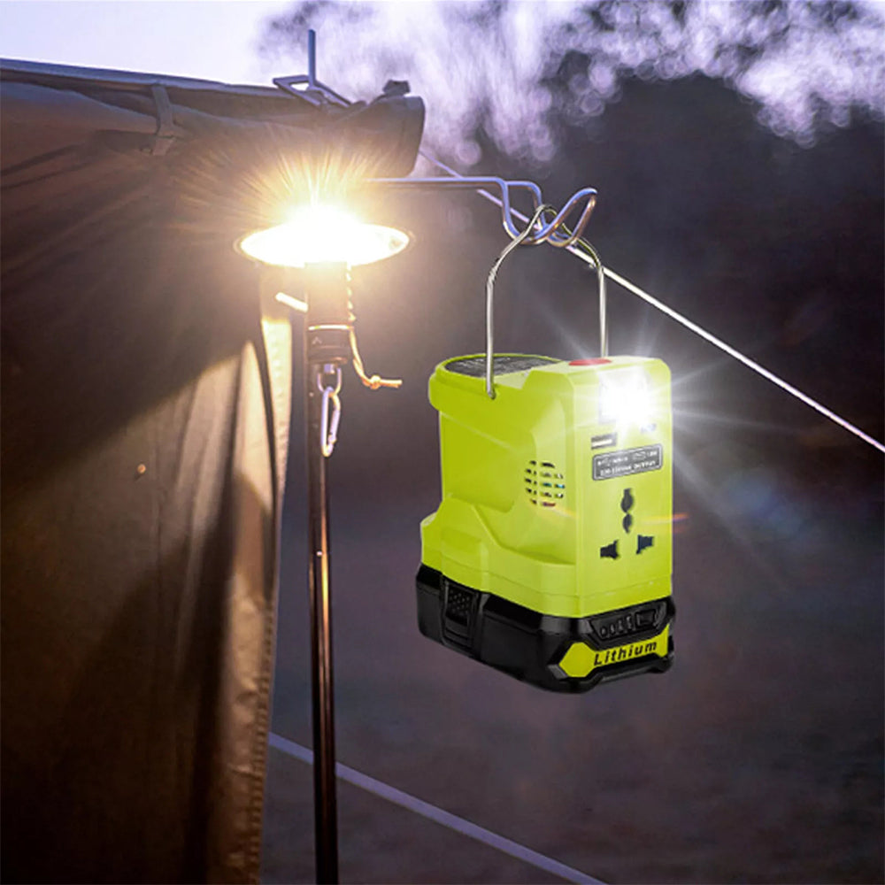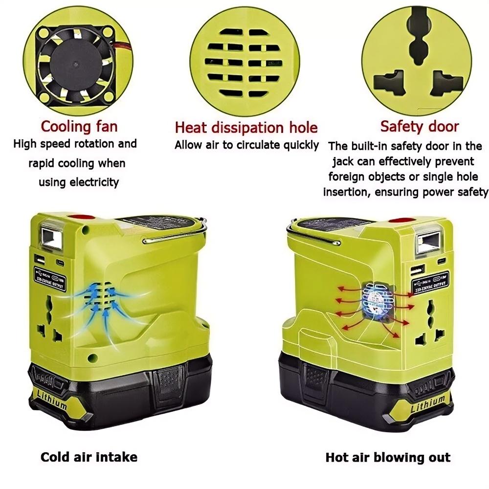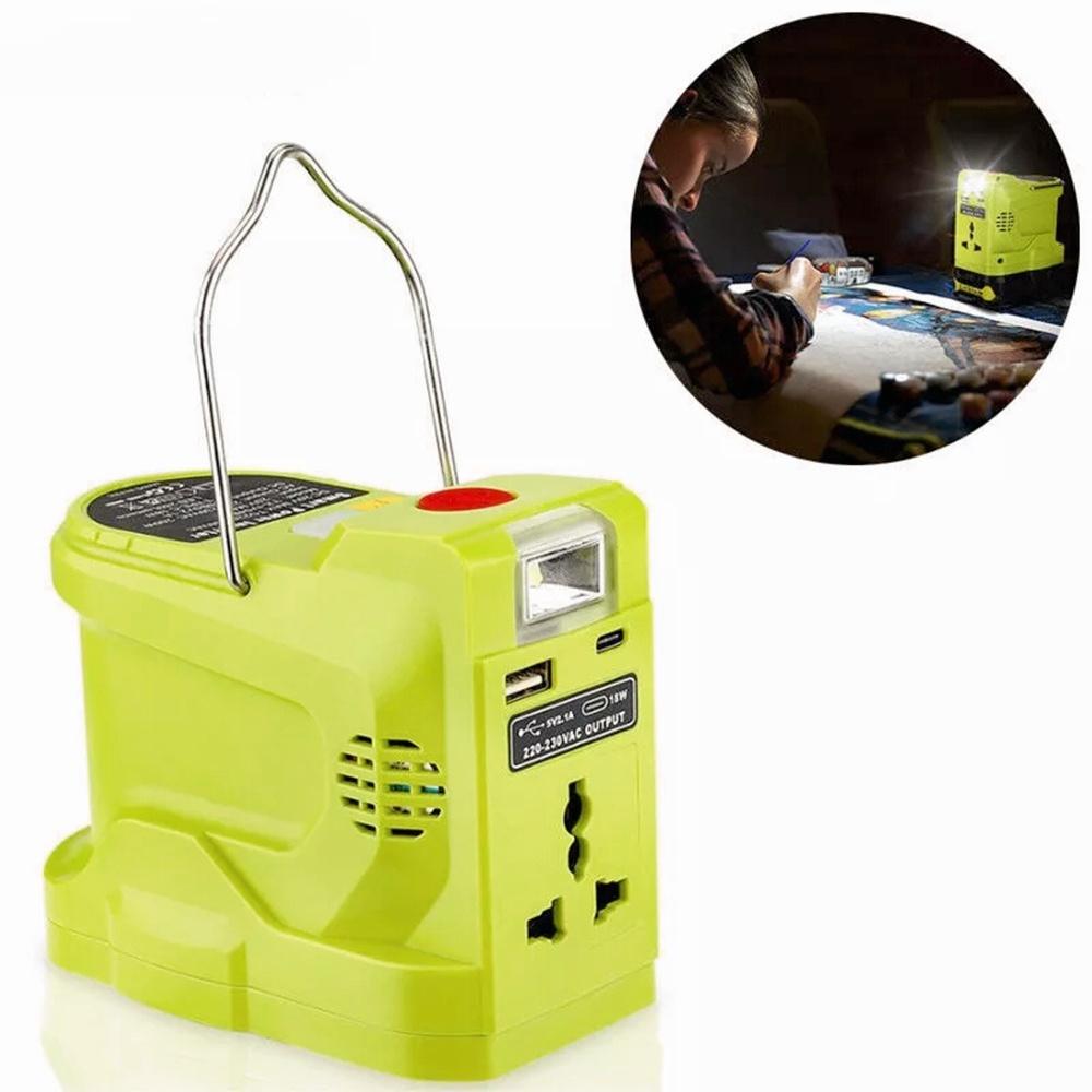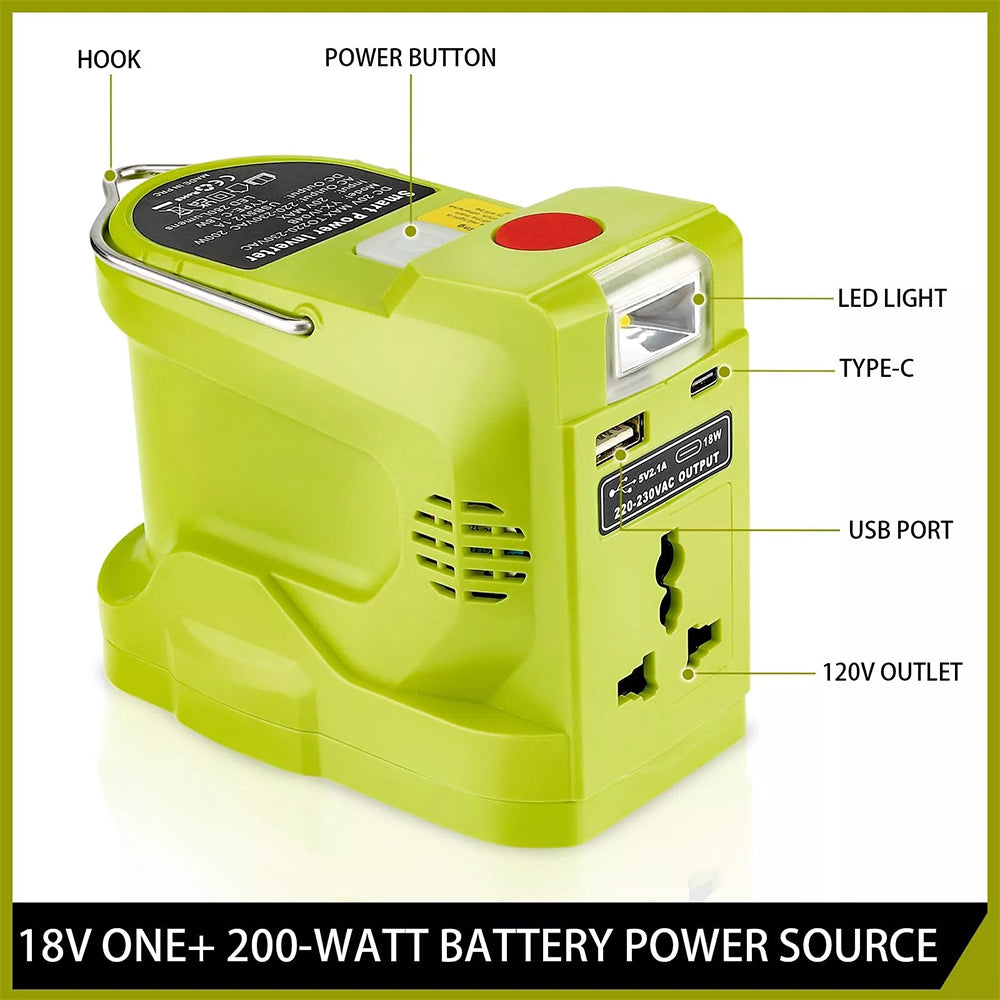 - 200W Power Inverter: Ideal for powering small electronic devices during power outages, camping, or travel. Compatible with Ryobi 18V Lithium-Ion, Ni-Cd, and Ni-Mh batteries (battery not included).