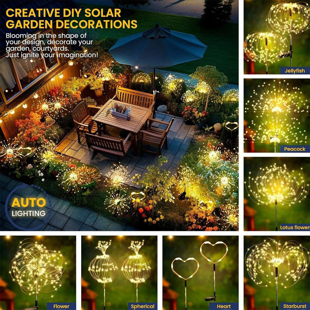 Powered by an upgraded solar panel and a built-in high-capacity battery, these lights efficiently harvest sunlight during the day (4-6 hours of charging) and provide continuous illumination for 8-10 hours at night—no more worrying about short lighting time. Made of durable weatherproof and anti-rust materials, they withstand extreme weather conditions (rain, snow, wind) and require no complicated wiring. Simply place them in a sunny spot, and they’ll automatically turn on at dusk and off at dawn, offering a hassle-free, eco-friendly lighting solution that saves you money on electricity bills. With a long lifespan and unique firework-inspired design, these solar lights are the ideal choice for enhancing your outdoor decor all year round.