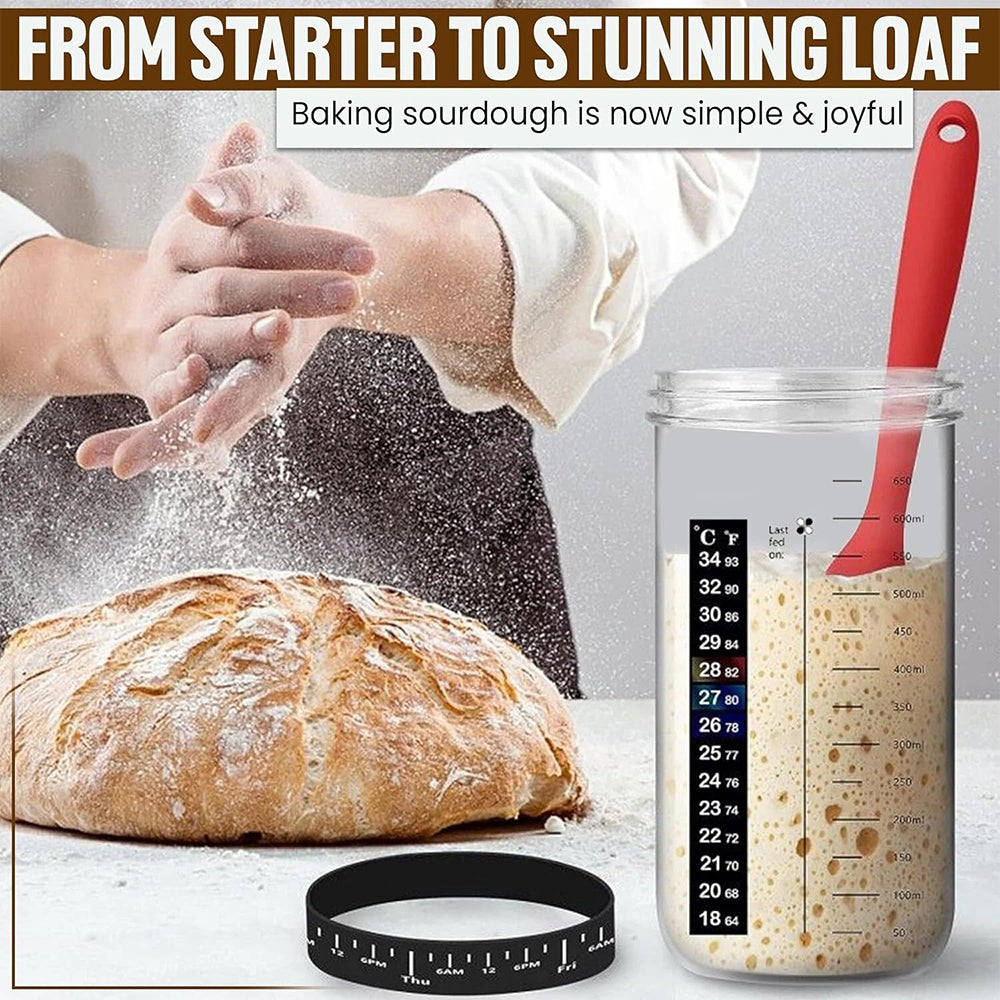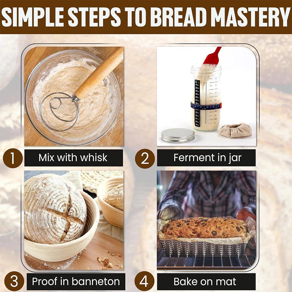 • Premium Baking Mats & Jar: A non-stick silicone kneading mat and a heat-resistant baking mat with dual handles provide convenient surfaces for kneading and baking. The 24oz glass fermentation jar with lid and a long silicone spatula are perfect for starter maintenance and fermentation.