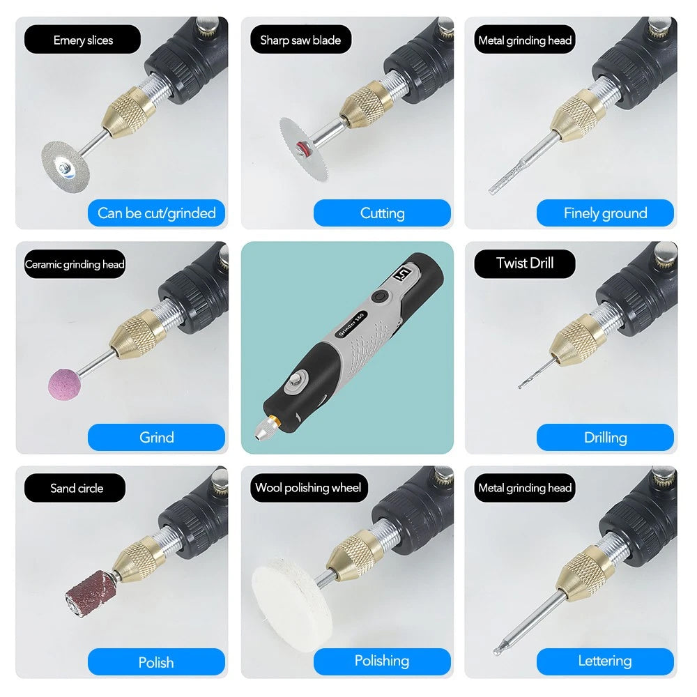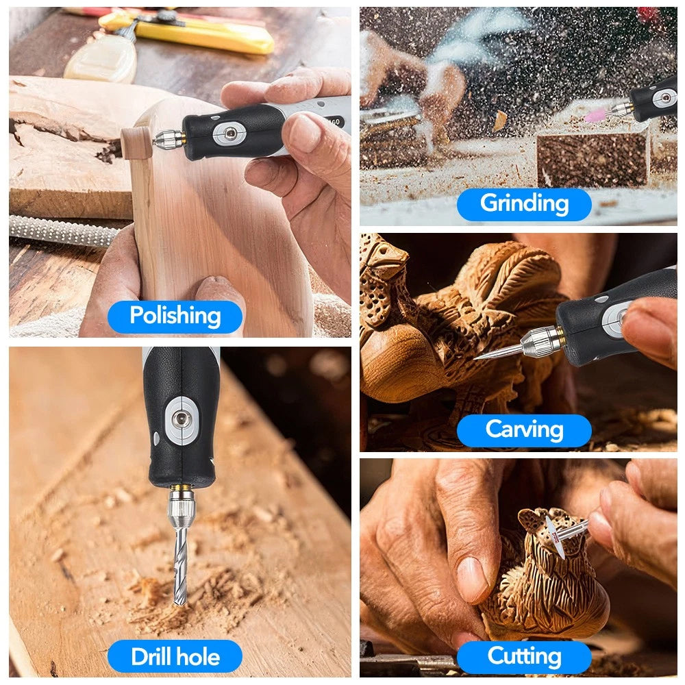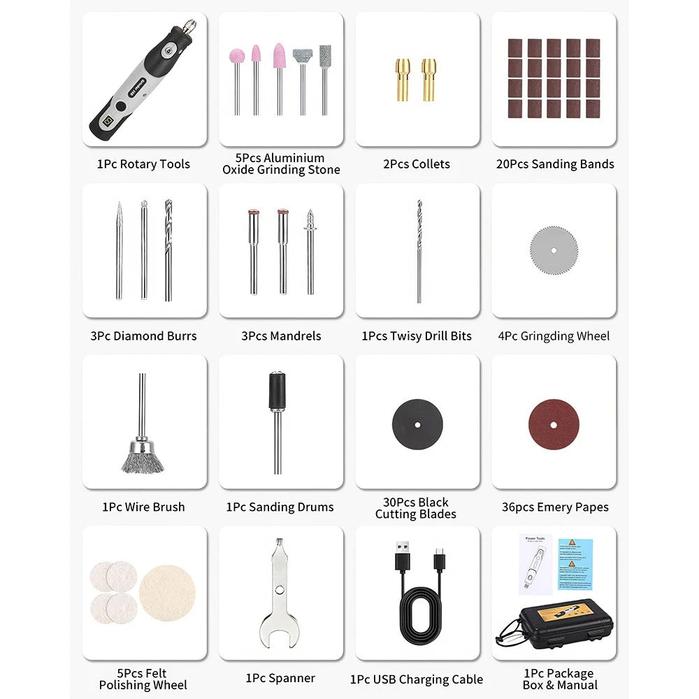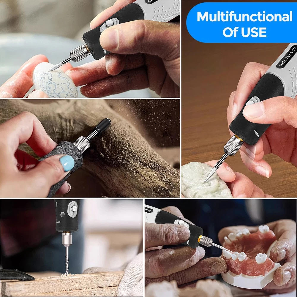 The Mini Multi-Function Electric Rotary Tool is an essential addition to your toolkit, offering versatility and precision for a variety of tasks. Powered by a built-in lithium battery, this compact, lightweight tool features 5 adjustable speed settings, allowing you to tackle cutting, engraving, grinding, drilling, sanding, and polishing with ease. With 113 accessories included, it's perfect for DIY projects, home repairs, crafts, and more. Its ergonomic design ensures comfortable use, even during long sessions, and the quick-change function makes switching accessories a breeze.