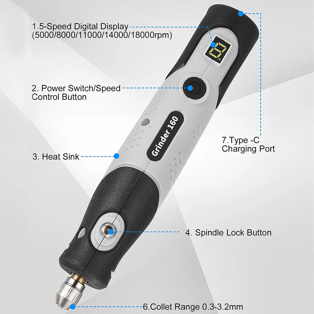 - 5 Adjustable Speed Levels: With five speed settings (5000/8000/11000/14000/18000 RPM), you can easily adjust the speed to suit different materials and tasks, offering optimal power for various applications, from fine engraving to heavy-duty grinding.