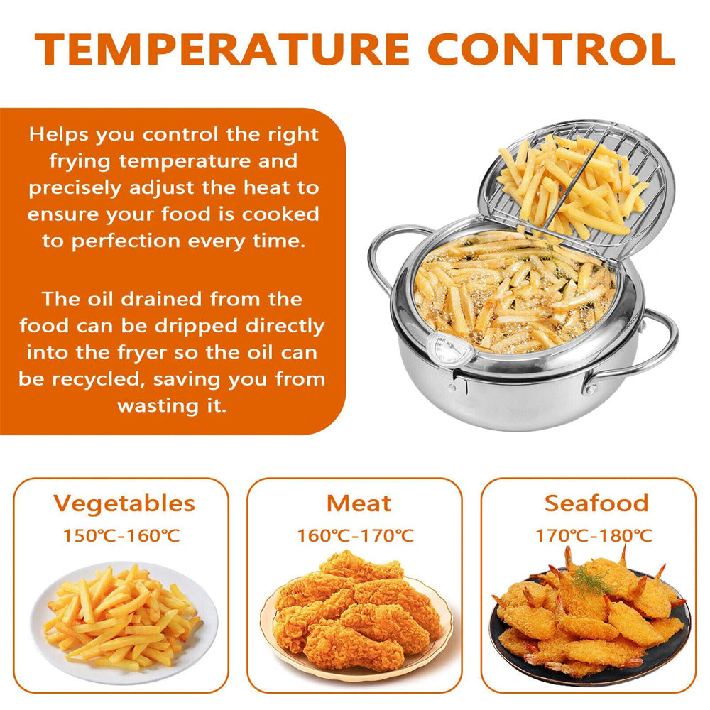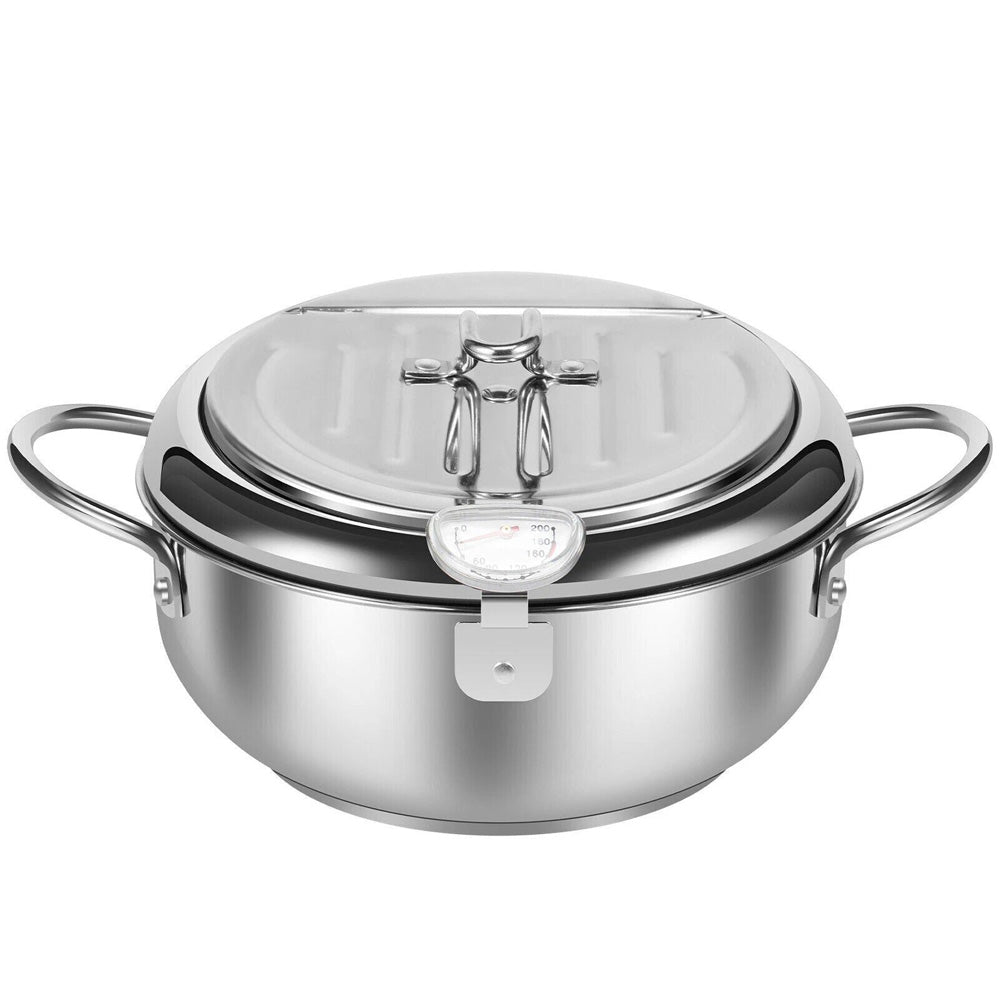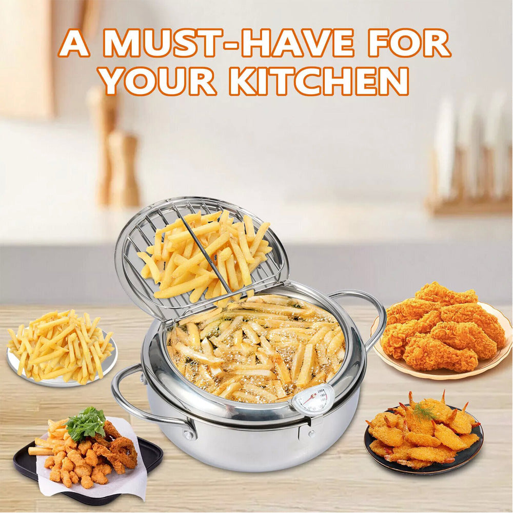 Elevate your frying game with our premium Deep Fryer Pot, designed to bring restaurant-quality results to your home kitchen. Crafted from high-grade food-grade 304 stainless steel, this durable pot ensures long-lasting performance, even heat distribution, and excellent heat resistance—perfect for achieving crispy tempura, golden fries, juicy chicken wings, and more. It works seamlessly with all cooktops, including induction, electric, and gas stoves, making it a versatile addition to any kitchen. With thoughtful features like a built-in thermometer for precise temperature control, a splash-proof lid for safer cooking, and a removable strainer basket for easy draining, this fryer pot simplifies both the cooking and cleanup process. Whether you’re frying for 3-4 people or using it as a daily crockpot for soups and stews, it’s a must-have tool to enhance your culinary creations.