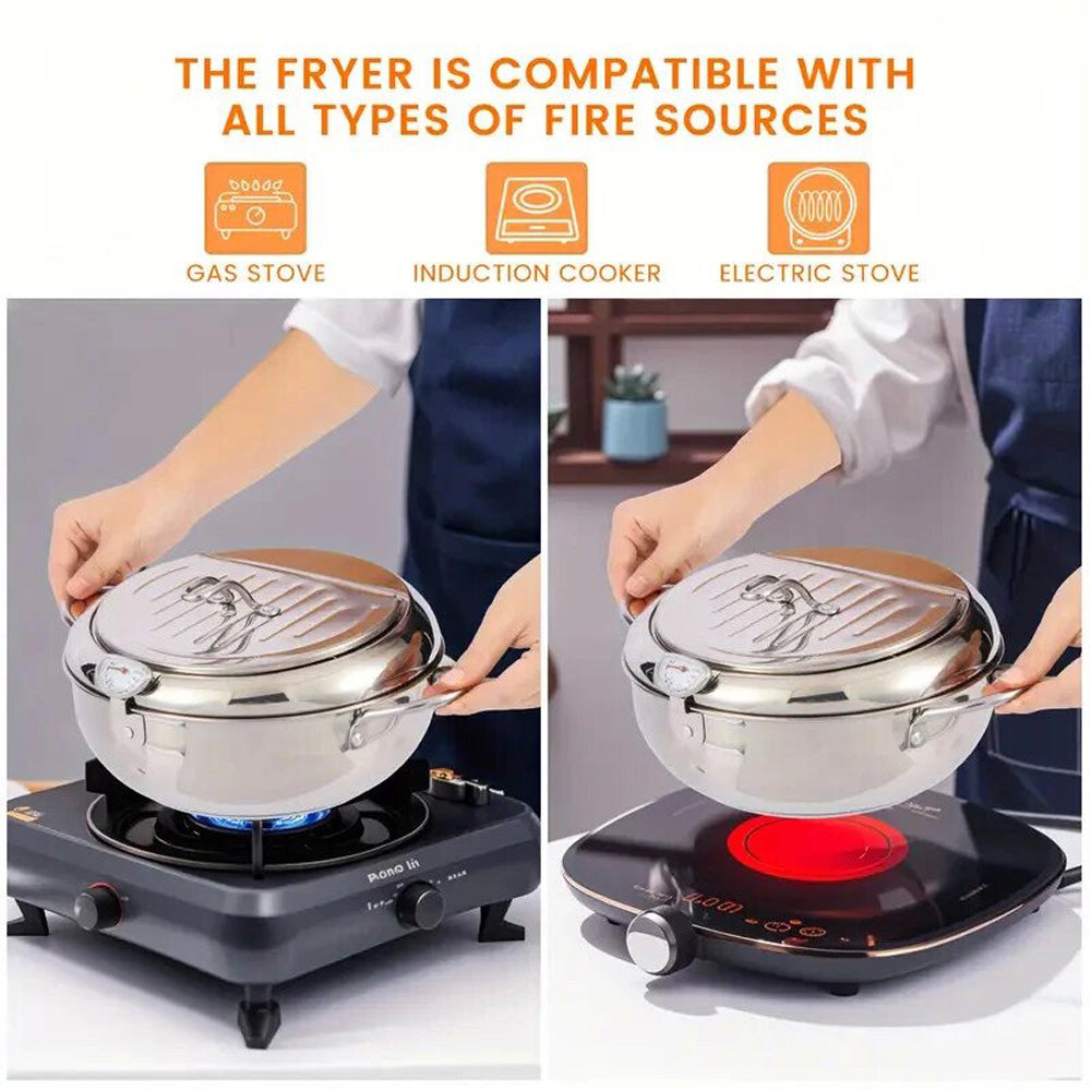 - High-Quality 304 Stainless Steel: Made from food-grade 304 stainless steel, ensuring durability, corrosion resistance, and even heat distribution for consistent frying results. Compatible with all cooktops (induction, electric, gas).