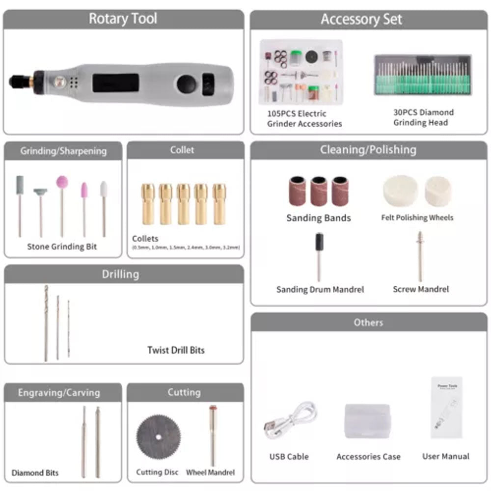 - Comprehensive Accessory Kit: Includes 105PCS grinder set and 30PCS diamond grinding heads for multi-functional use (engraving, carving, sanding, polishing nails, etching, routing, cutting, and drilling).