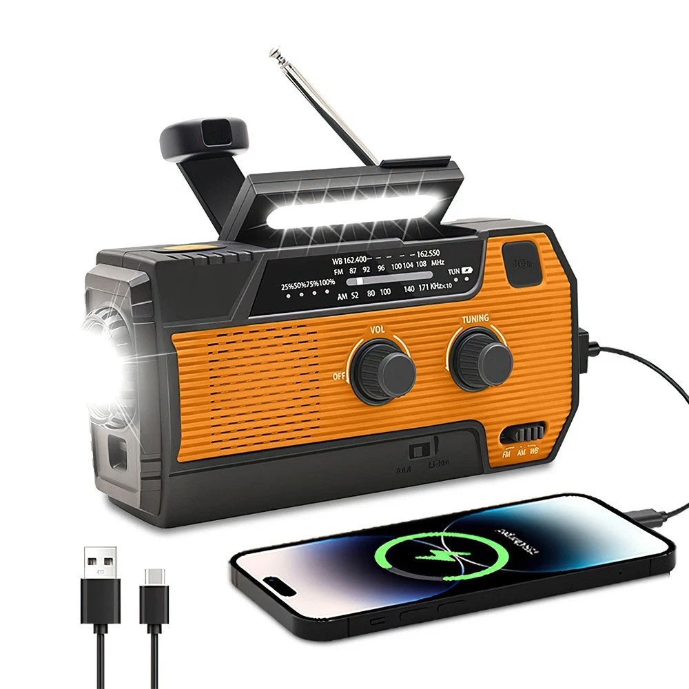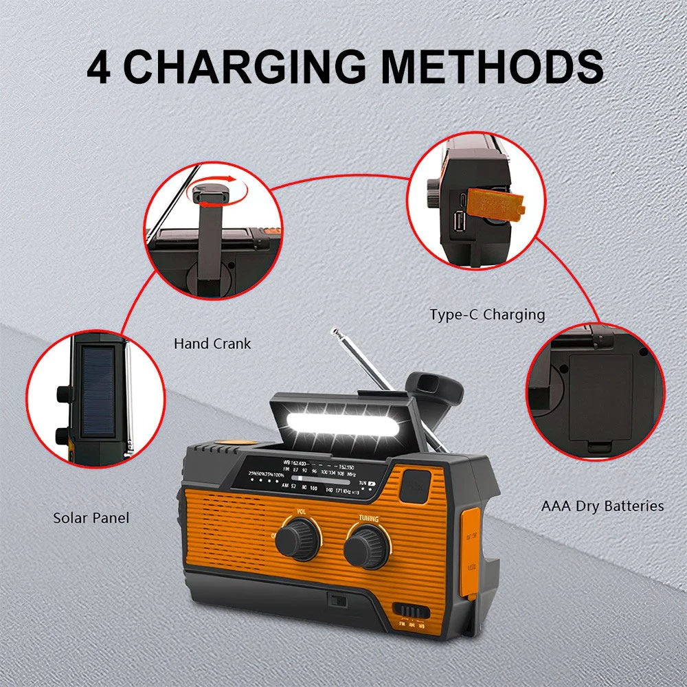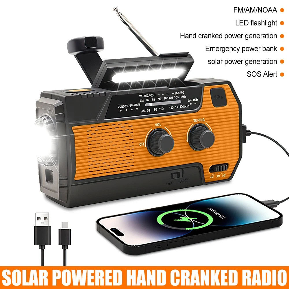 This emergency solar hand crank weather radio is a versatile all-in-one device designed for outdoor activities, travel, and unexpected power interruptions. It combines radio reception, lighting, alarm functions, and a built-in power bank in a compact, durable design. With multiple charging options including solar, hand crank, and USB, it helps keep essential functions available even when conventional power sources are unavailable.