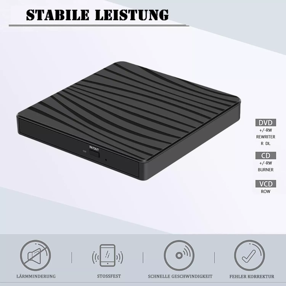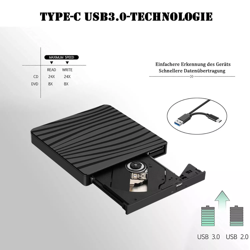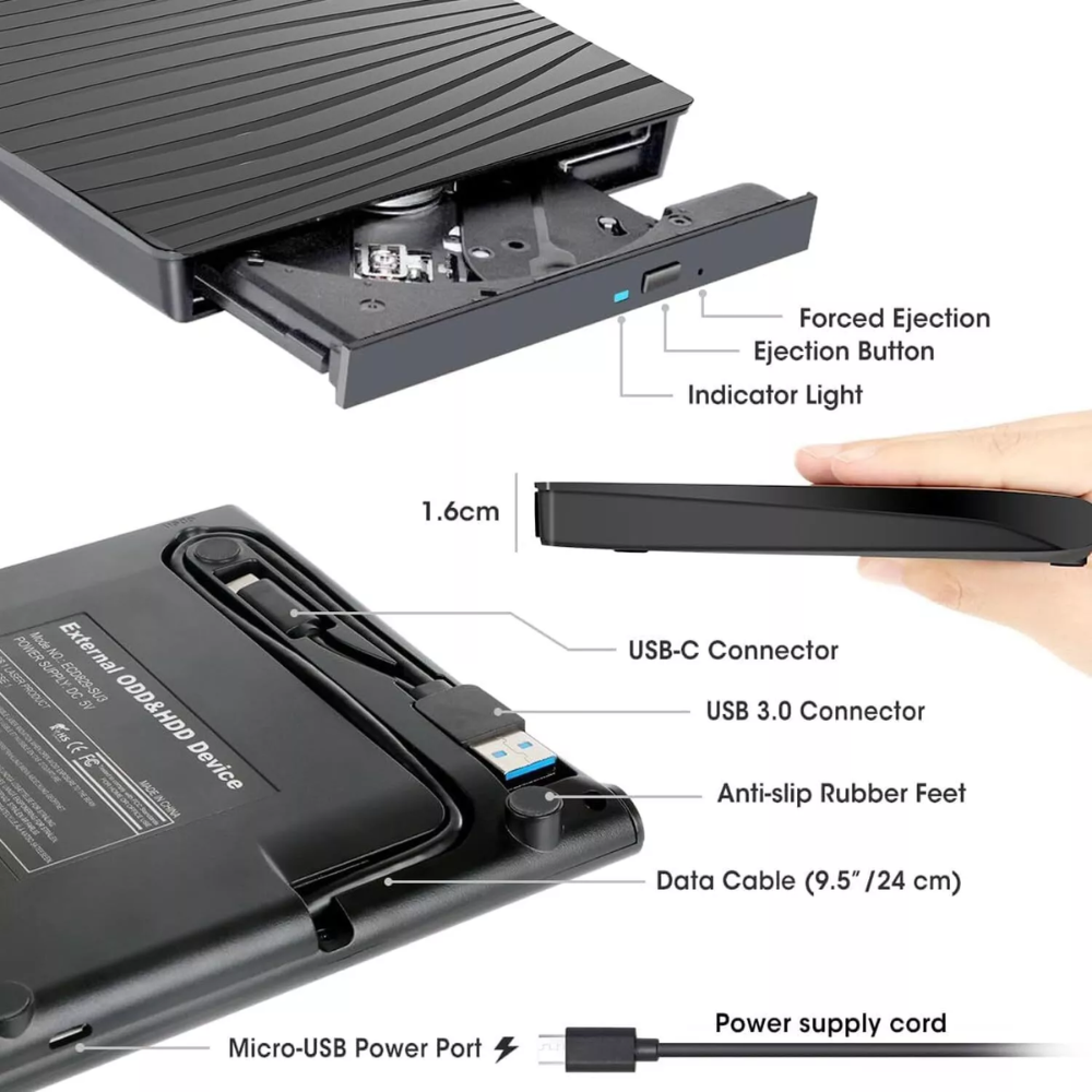 The USB 3.0 External DVD Drive is the perfect solution for fast and stable data transfer with dual interfaces – USB 3.0 and Type-C. With a transfer speed of up to 5 Gbps, it ensures smooth and quick data exchange. Whether you're watching HD movies, burning files, installing software, or creating backup CDs, this external drive offers all the functionality you need without the need for an additional power supply or DVD driver. It is compatible with both USB 2.0 and USB 1.0 ports. The included Type-C adapter provides broad compatibility, making it easy to use with various devices, including Windows PCs, MacBooks, and laptops.