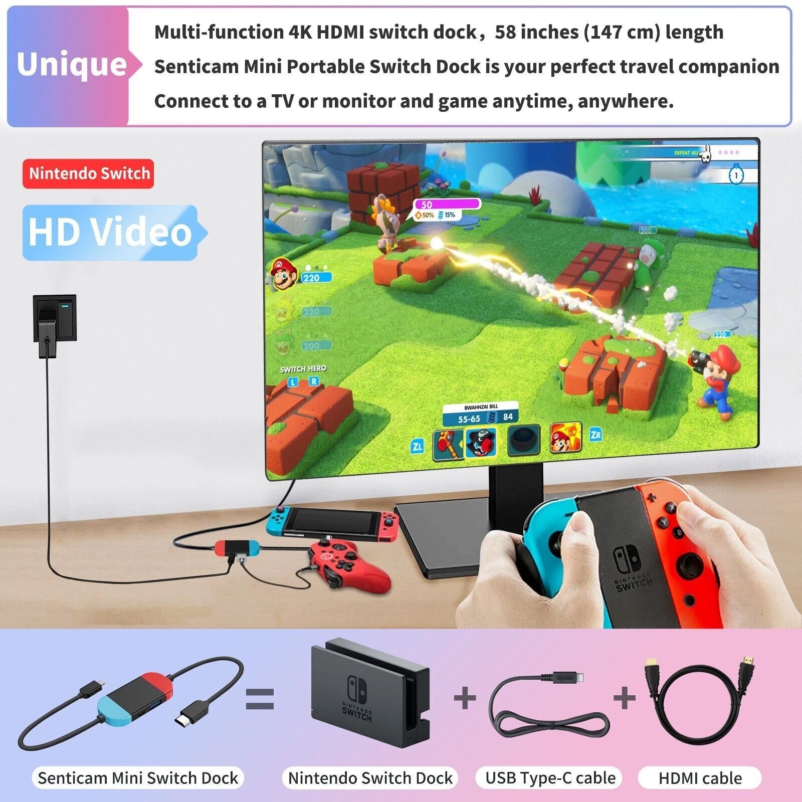 - All-in-One Replacement: Combines the functions of the original bulky Nintendo Switch dock, HDMI cable, and Type-C cable in one device.