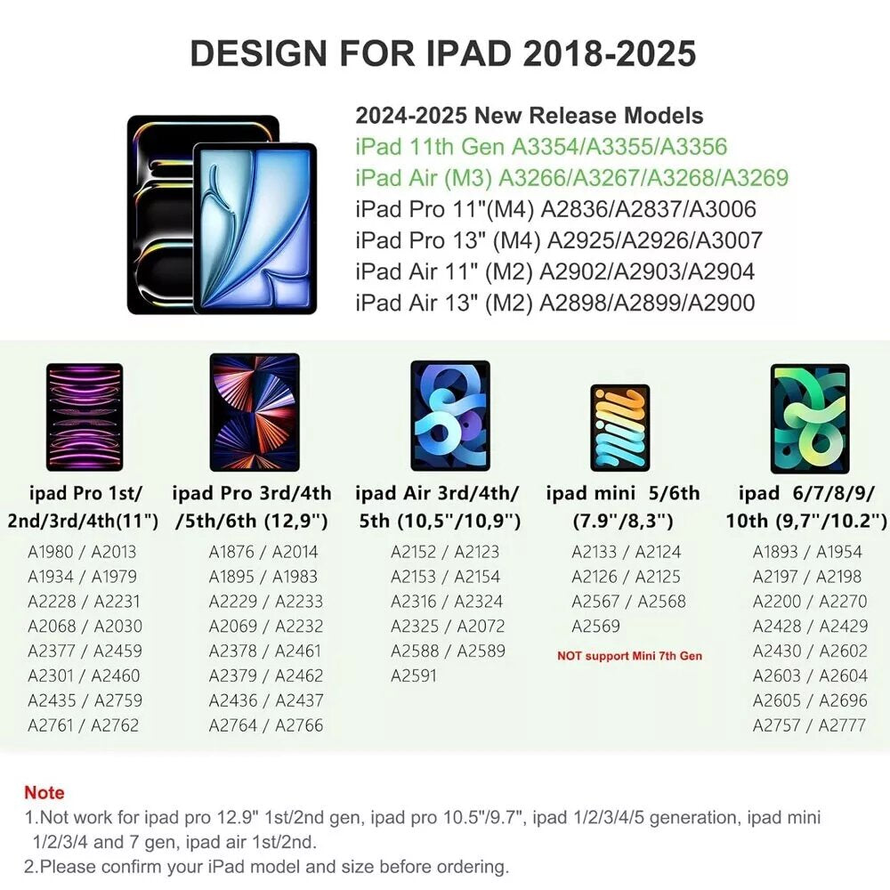 - Broad Compatibility: Works with iPad 6/7/8/9/10/11 generation, iPad Air M2/M3/3/4/5 generation, iPad Mini (5/6 generation), iPad Pro 11" (M4/1/2/3/4 generation), 13" M4, and 12.9" (3/4/5/6 generation). Not compatible with iPad Pro 12.9" 1st/2nd gen, iPad Pro 10.5"/9.7", iPad 1–5 generation, iPad Mini 1–4, or iPad Air 1/2.