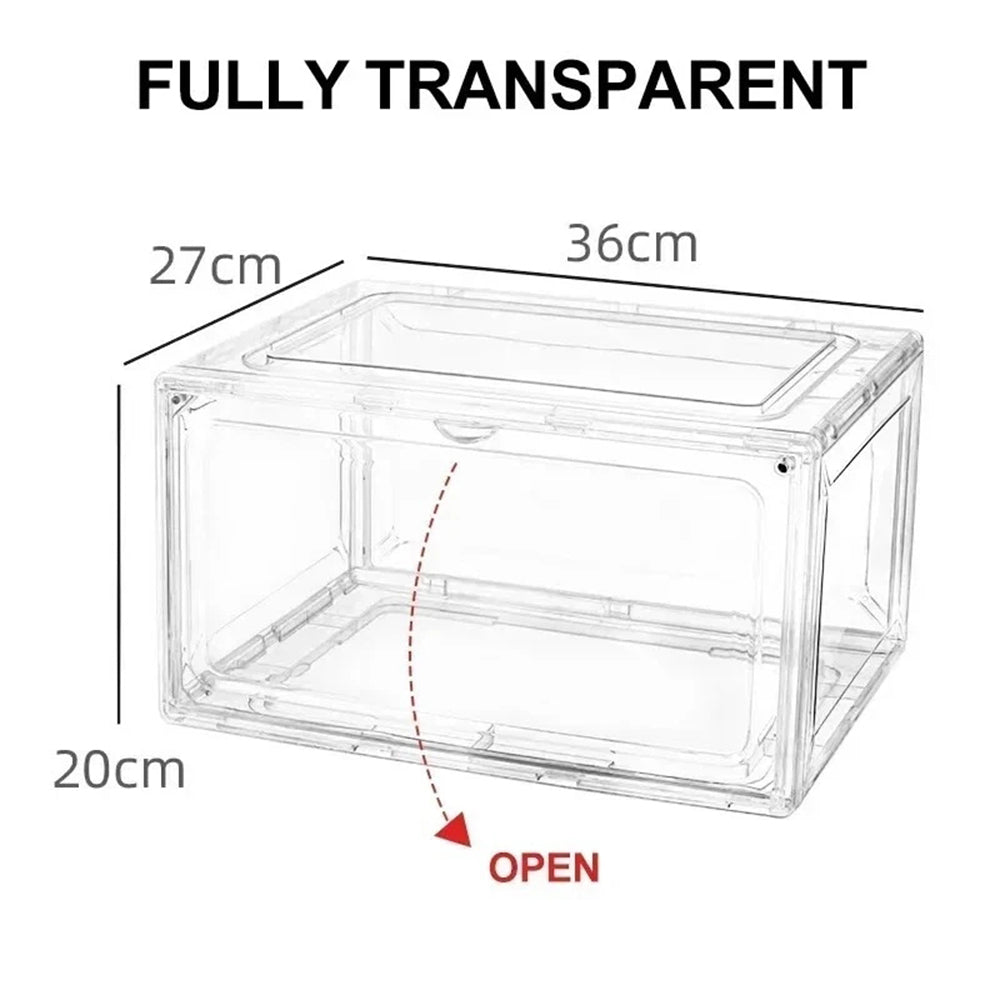 Crafted from durable yet lightweight polypropylene (PP), this innovative shoe organizer offers a practical, efficient, and stylish way to keep your shoes neatly stored and easily accessible. The interlocking design ensures a secure setup, while the foldable, compressible, and stackable features provide a space-saving solution for all shoe collections, big or small. Whether you prefer horizontal or vertical storage, our boxes can be oriented in both ways. Each unit is fully transparent, allowing you to showcase your shoes while making it easy to identify your favorite pair at a glance. Plus, with magnetic side-opening doors and the ability to stack multiple boxes, this shoe storage system will transform your space into a functional and aesthetically pleasing shoe display.