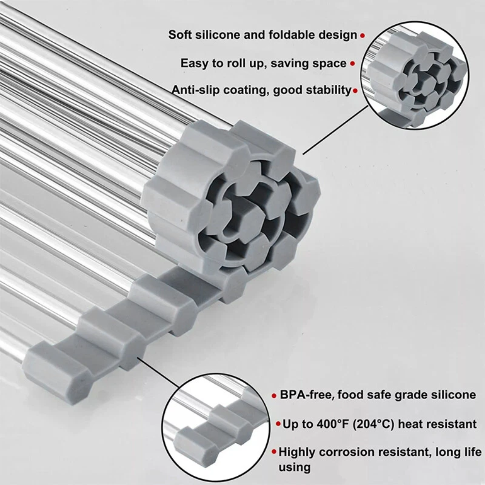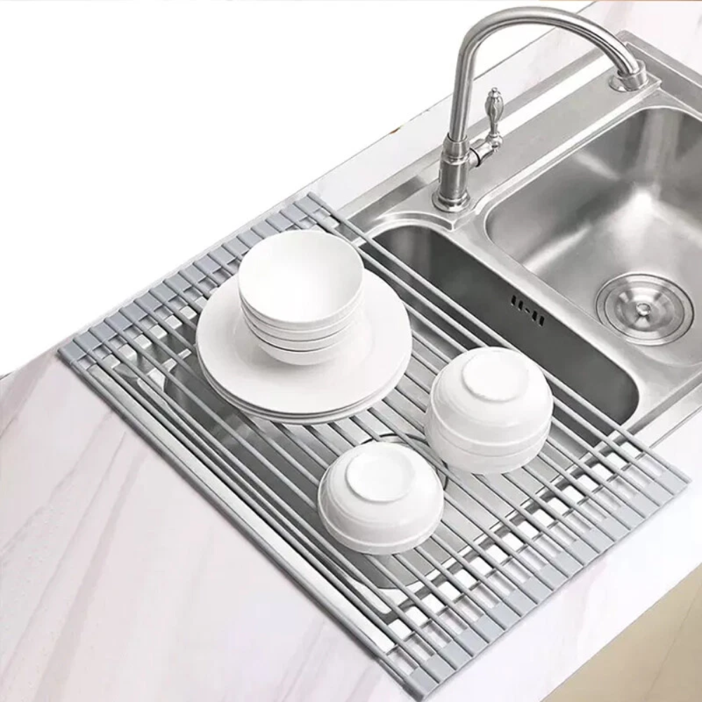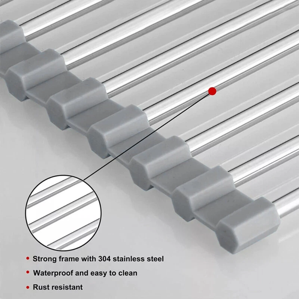 Roll Up Dish Rack Drainer Over Sink Stainless Steel Plate Holder Stand With Tray