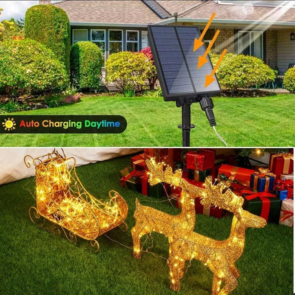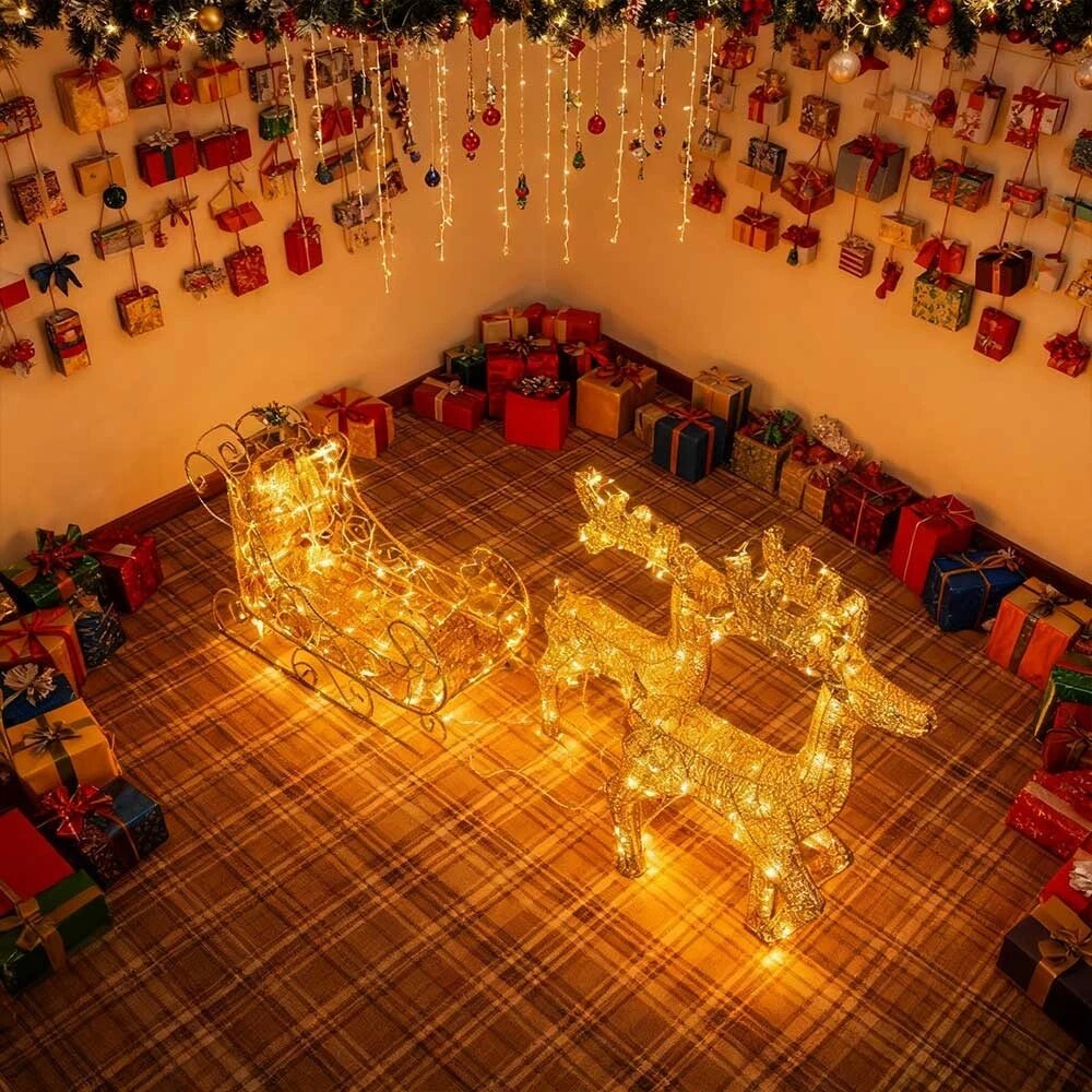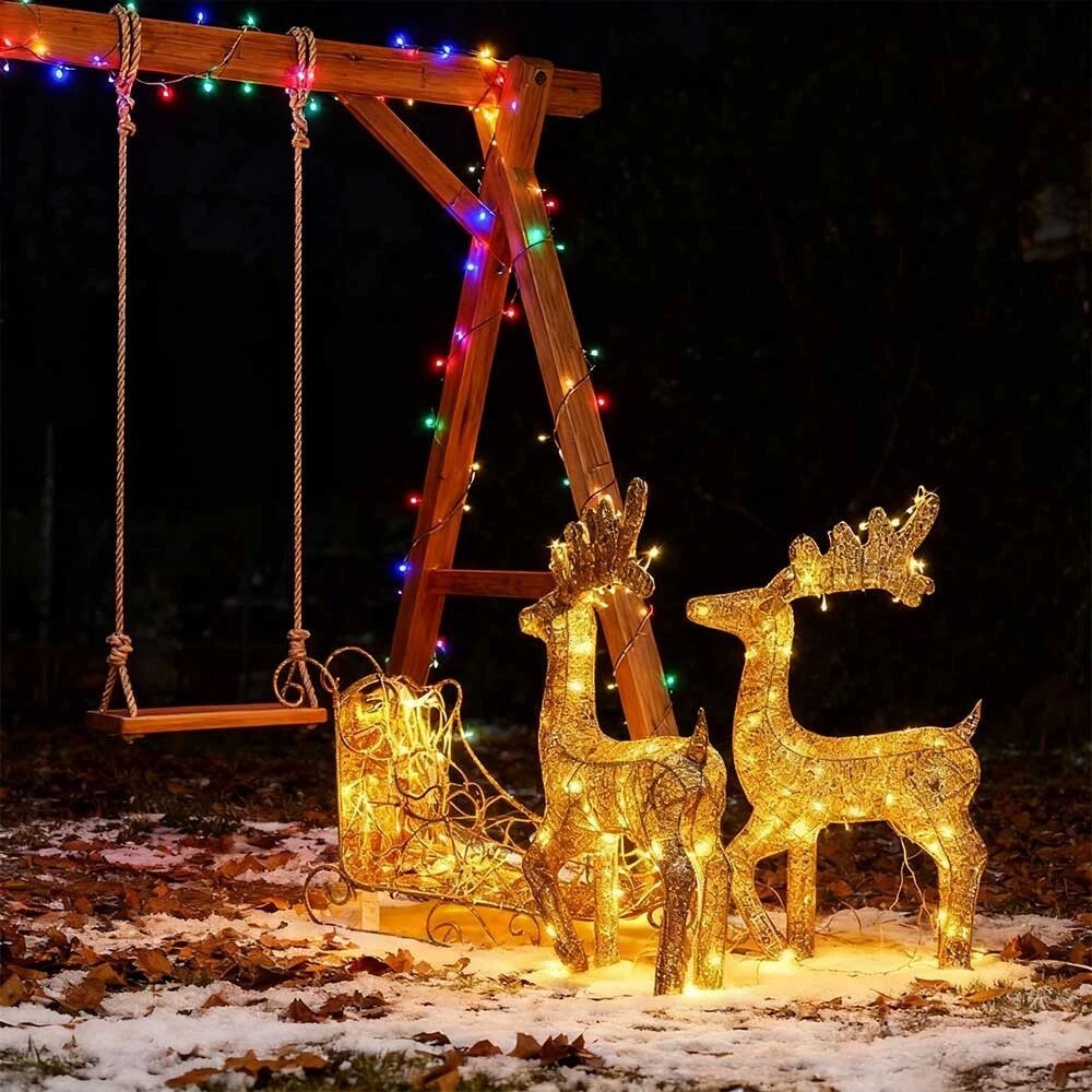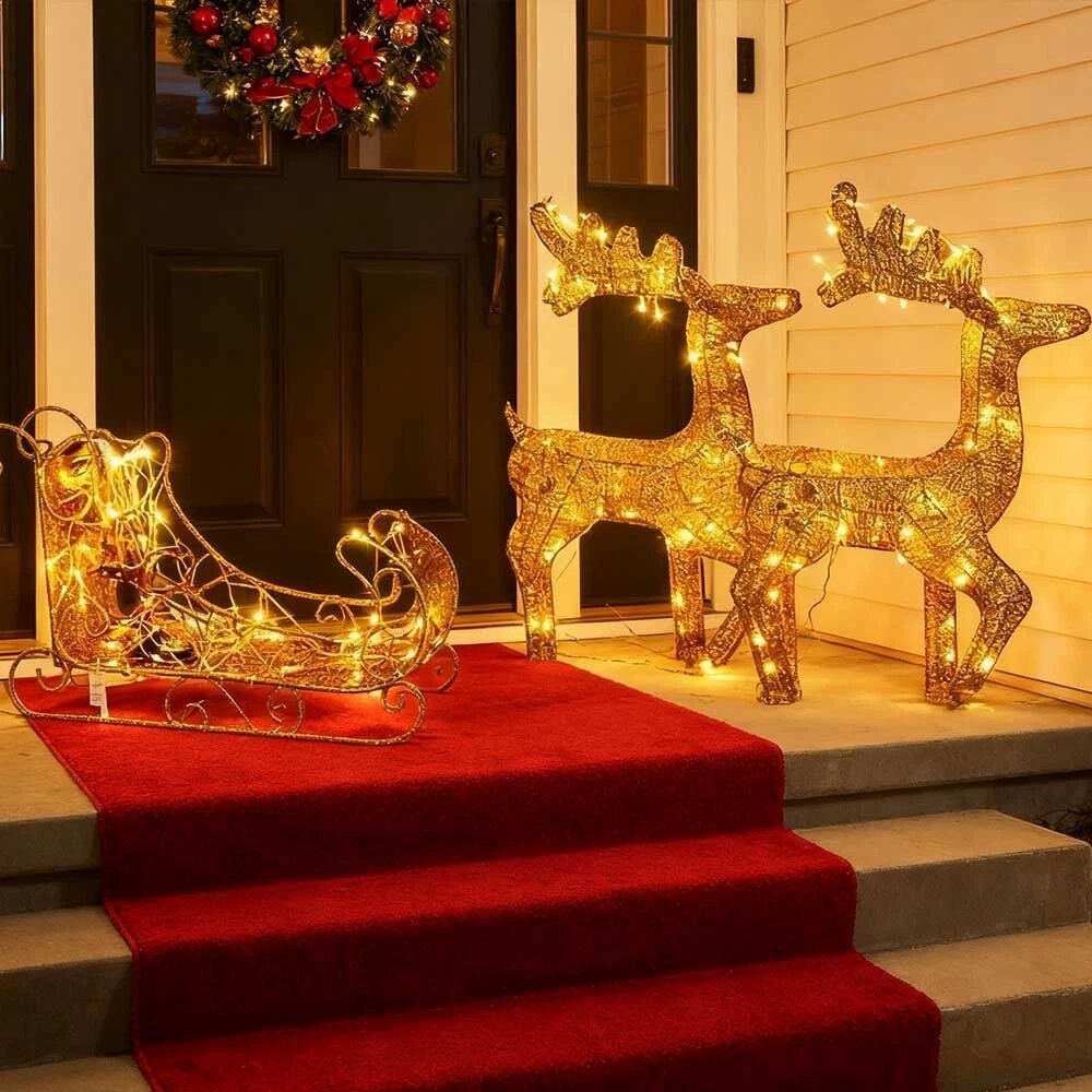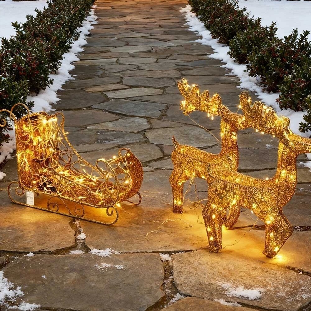 Pre-lit with soft, warm white LED lights, the set casts a cozy glow that transforms any space into a winter wonderland—perfect for holiday gatherings, family nights, or simply spreading Christmas cheer. Crafted with durable, weather-resistant materials (including a sturdy metal frame and gold glitter detailing), it stands up to rain, snow, and cold temperatures, ensuring long-lasting beauty throughout the holiday season. Whether you arrange the reindeer and sleigh together for a classic scene or position them separately to suit your space, this solar-powered decor is sure to be the centerpiece of your Christmas celebrations.