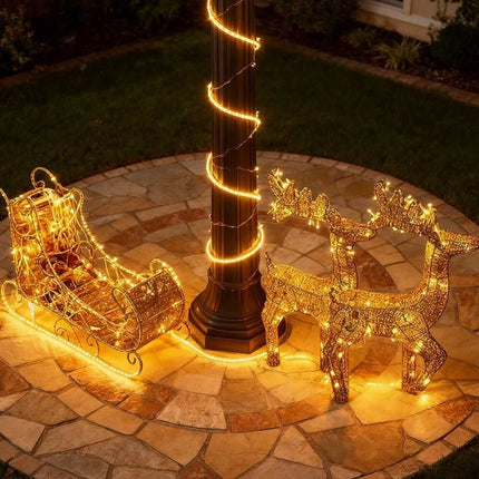 - Warm White LED Glow: Pre-installed warm white LEDs emit a soft, consistent light that creates a welcoming, festive atmosphere. The gentle glow enhances the golden glitter detailing, making the reindeer and sleigh stand out day and night.