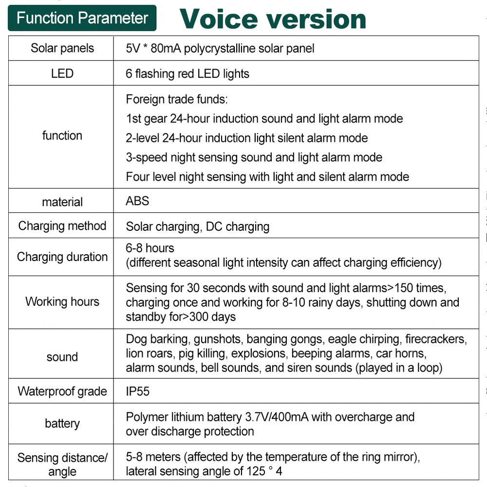 • Wide Application: Perfect for residences, farms, villas, hotels, markets, boarding houses, etc., to repel animals and prevent intrusions.