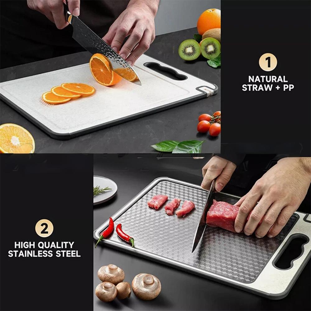 • 2-in-1 Versatile Design: One side is made of food-grade 304 stainless steel, ideal for cutting raw and cooked meat, while the other side features a wheat straw PP material, perfect for vegetables and fruits. This dual design helps avoid cross-contamination, ensuring a healthy and odorless cutting experience.