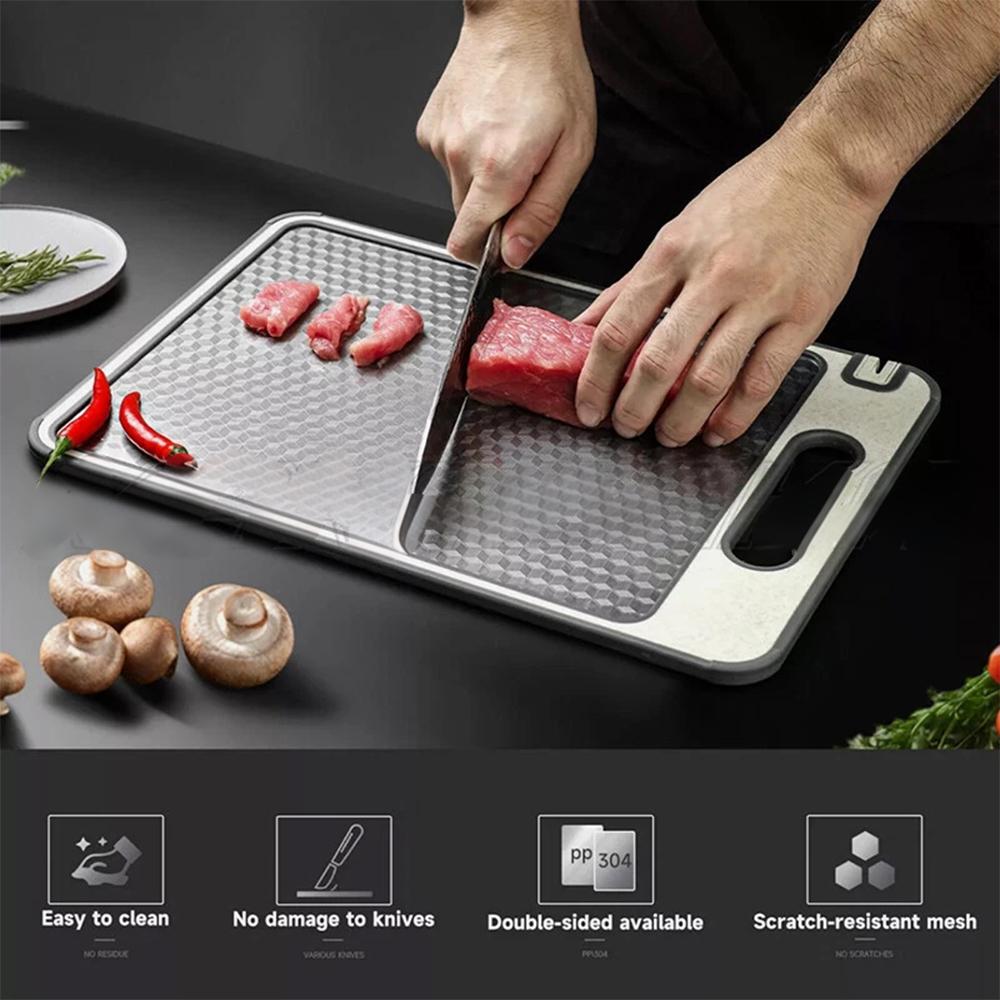 Upgrade your kitchen tools with this versatile 2-in-1 cutting board, combining durability, functionality, and eco-friendly design. Made from premium materials like food-grade 304 stainless steel and wheat straw PP, this cutting board is perfect for cutting meat, fish, vegetables, and fruits. With its antimicrobial properties, mesh panel design, and easy-to-clean surface, it offers a hassle-free experience for everyday kitchen tasks. The built-in juice groove, garlic grinding area, and portable handle further enhance convenience, making it a must-have kitchen accessory. This sleek, silver-colored cutting board is also the ideal gift for any cooking enthusiast.