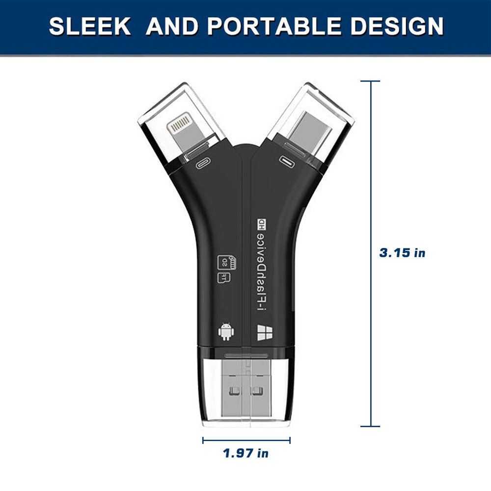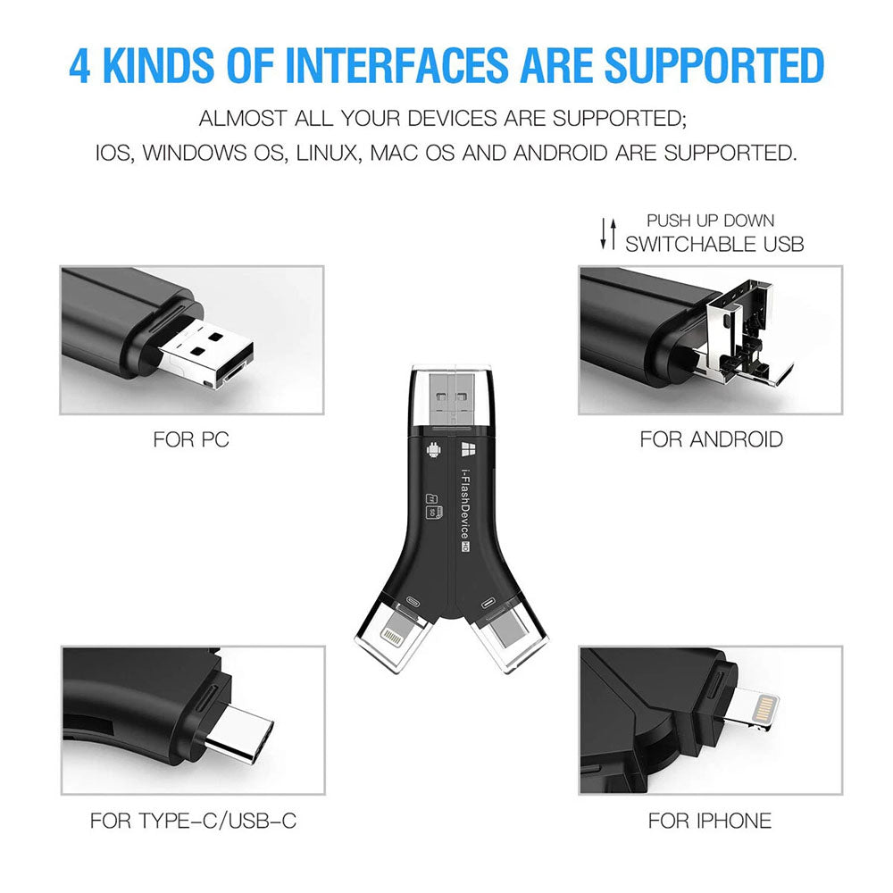 4-in-1 Multi-Interface: Equipped with USB, USB-C, Micro USB, and Lightning connectors for universal compatibility.