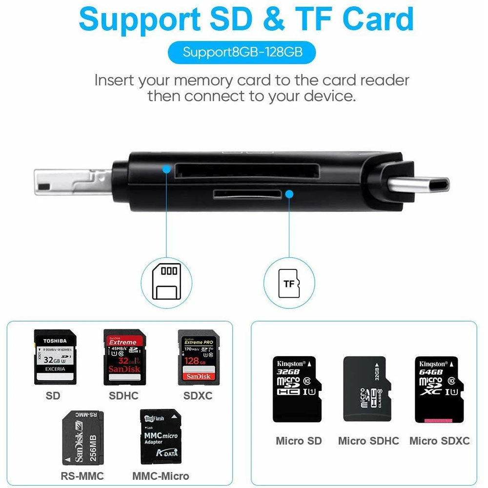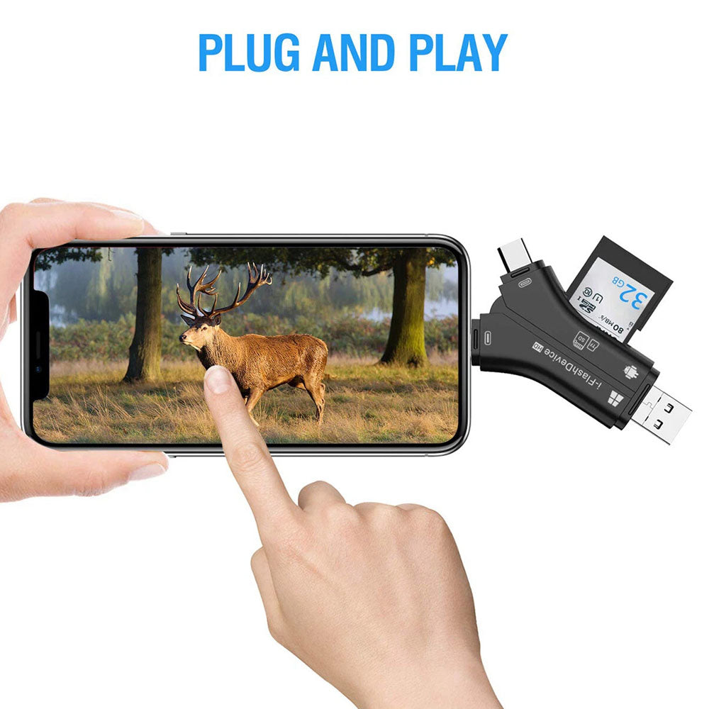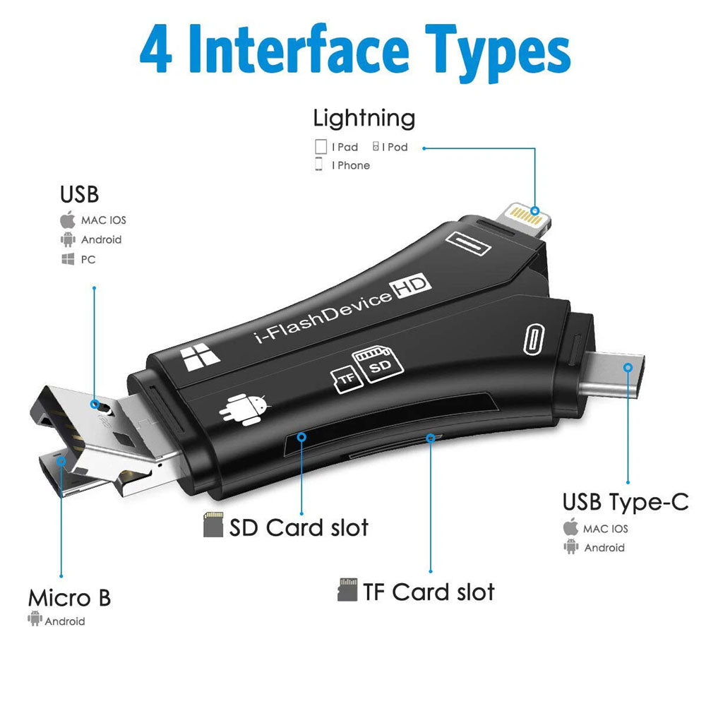 The 4-in-1 SD/TF Card Reader is the perfect solution for fast, reliable, and convenient file transfers. Designed with multiple interfaces—USB, USB-C, Micro USB, and Lightning—this compact reader is universally compatible with iOS, Android, Mac OS, Windows, and Linux devices.