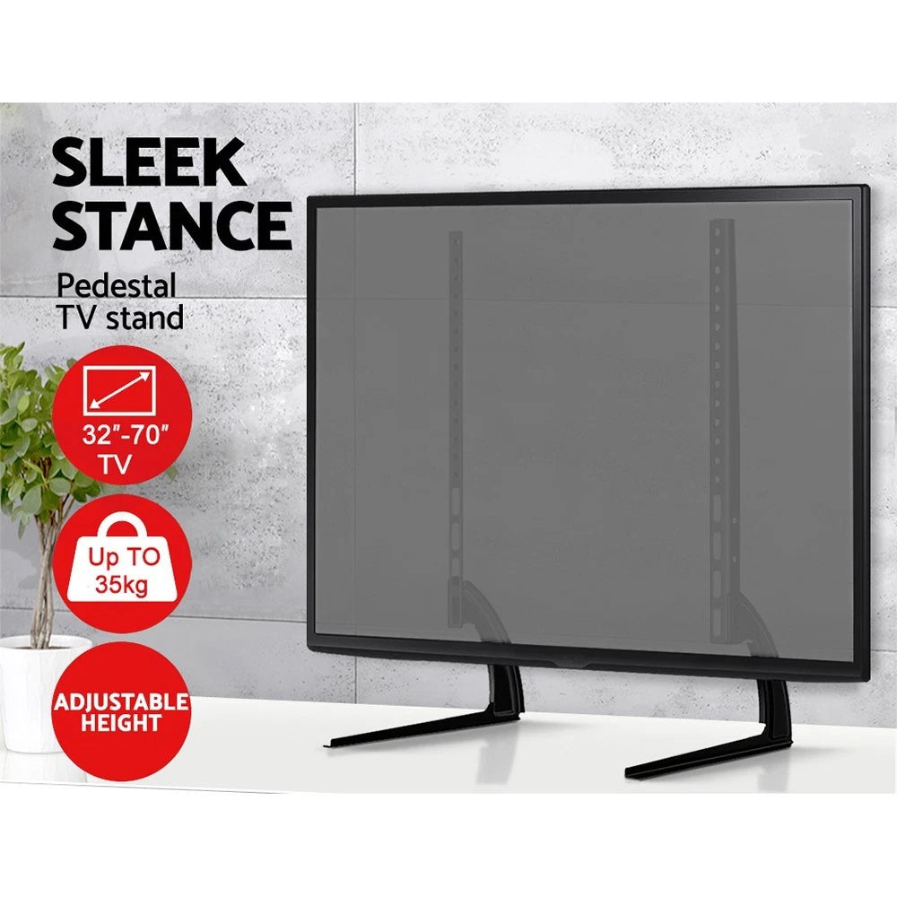 Elevate your entertainment setup with the Universal Pedestal TV Stand. This brand-new, sleek unit is designed to provide a modern and secure base for your flat panel television, combining robust construction with minimalist style. Crafted from solid, black powder-coated iron, this stand features a durable 2.5mm thick frame for exceptional stability. It offers universal compatibility with most major TV brands, supporting screens from 32 to 70 inches. With flexible VESA mounting patterns (including 200x200mm, 400x400mm, and 600x400mm) and a height adjustment range from 36cm to 48cm, you can achieve the perfect viewing angle. The unique curved legs and extended non-slip base work together to provide excellent balance and firm footing for your ensemble, ensuring it remains stable during use. Assembly is straightforward, making it easy to set up your viewing area quickly.