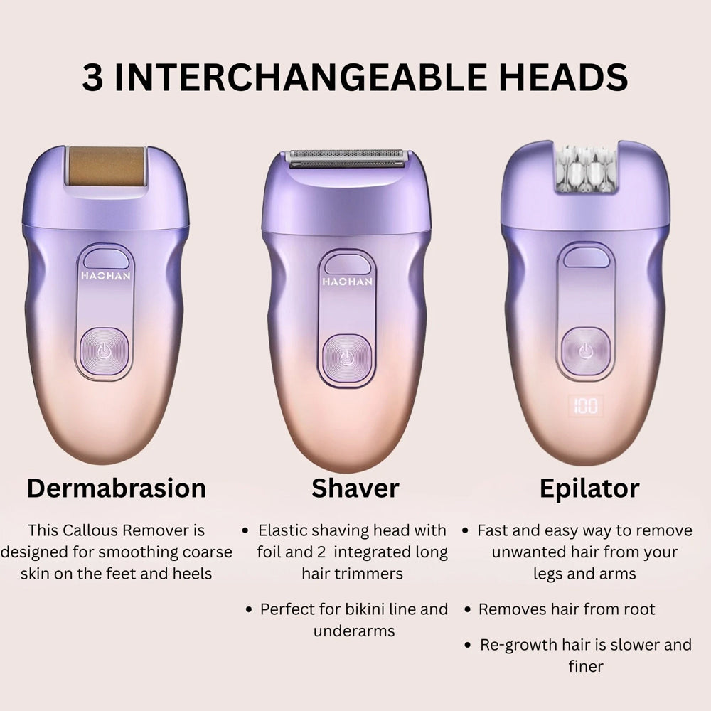 USB LED 3-in-1 Epilator for Women–Facial, Eyebrow &Body Hair Removal+ Exfoliator