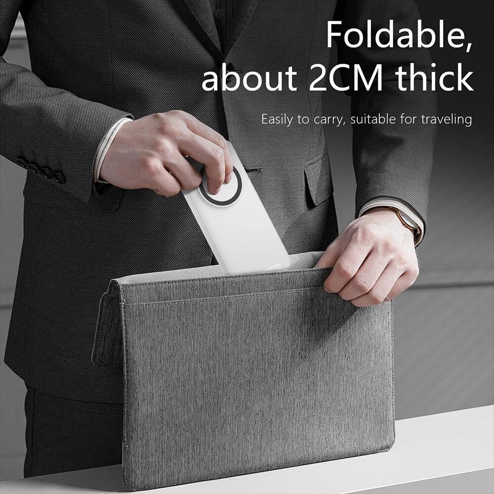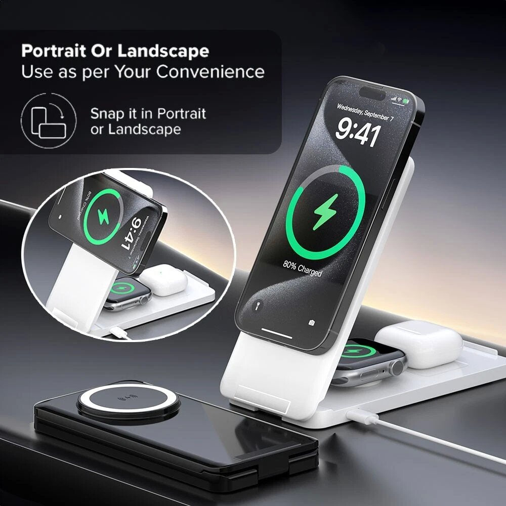 • Portable and Foldable: Measuring only 1.15 inches in thickness when folded and weighing just 0.7 lbs, this charging station is as compact as your phone. It takes up minimal space in your backpack, making it an ideal companion for vacations and business trips. No need to carry multiple chargers anymore - this 3-in-1 wireless charger meets all your charging needs.